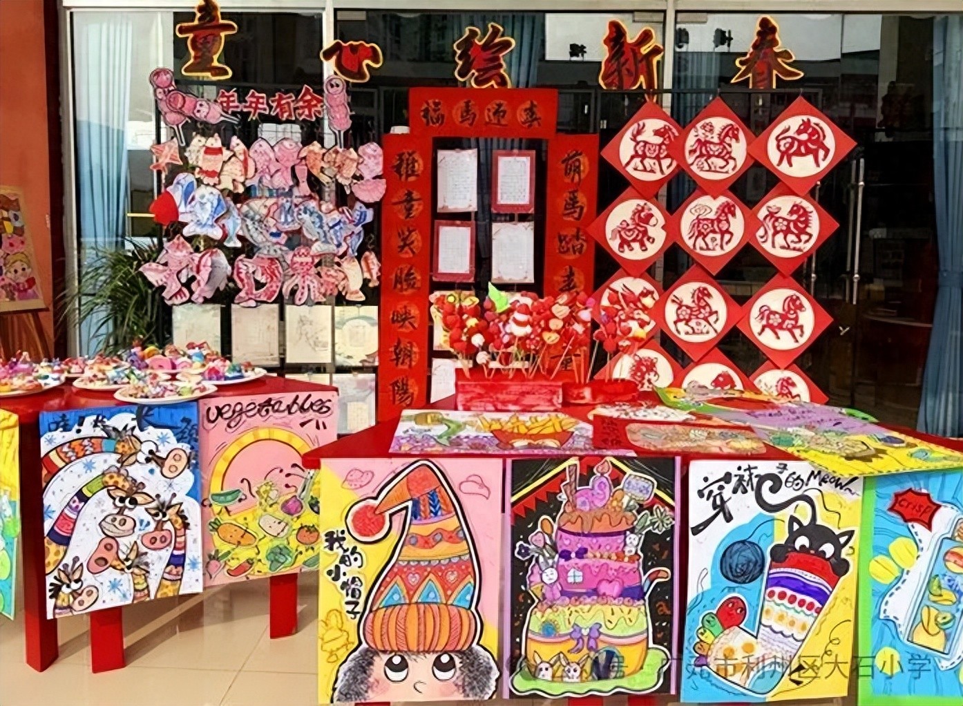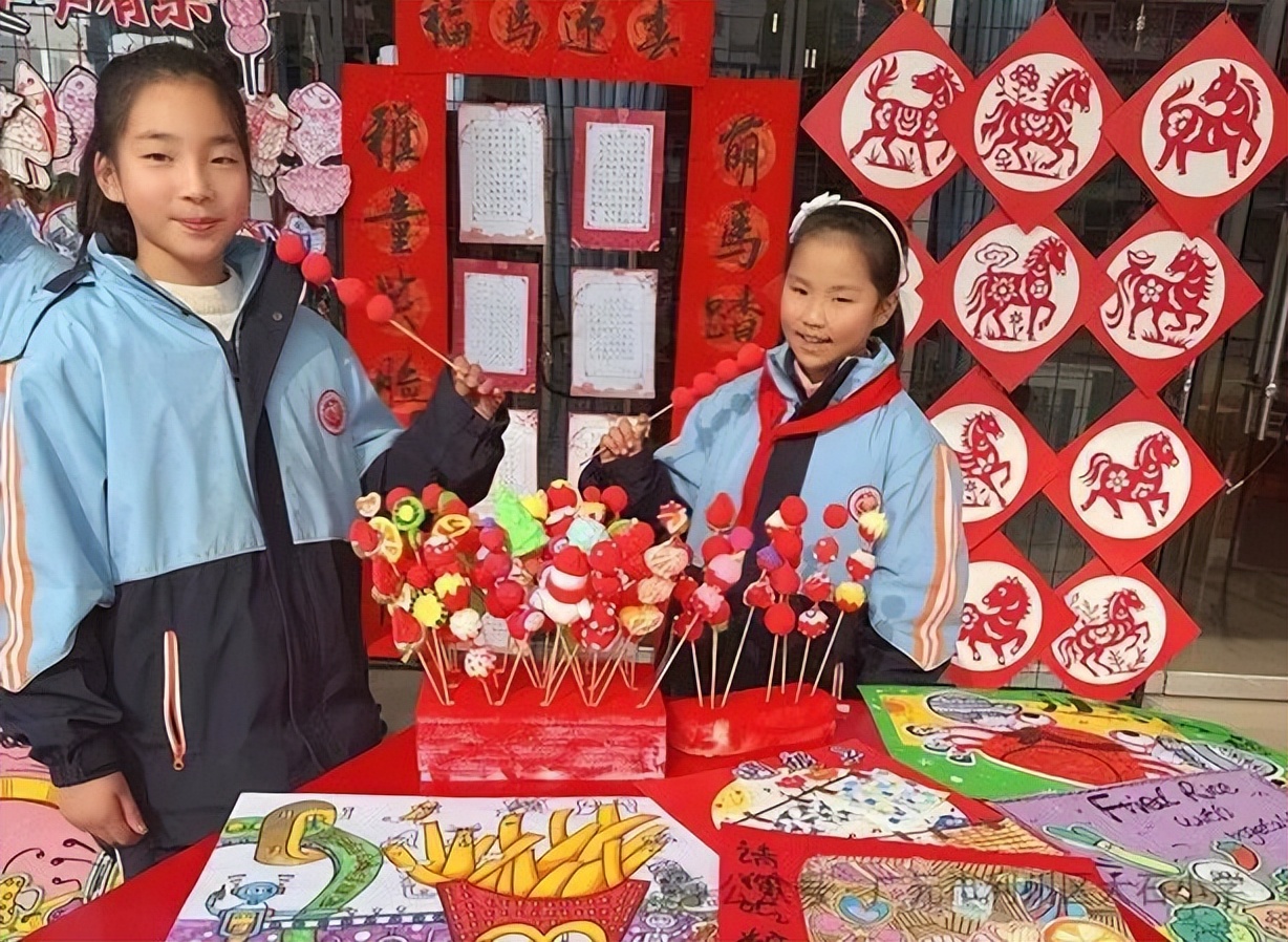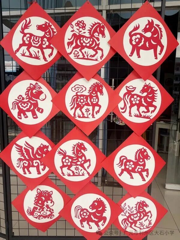 剪纸区域,剪纸作品线条流畅,福字、春字、窗花、生肖马等形象栩栩如生,跃然纸上。红纸在同学们的巧手中剪刻翻转,凝结着他们对民间艺术的传承与巧思,展现了中华优秀传统文化的独特魅力。