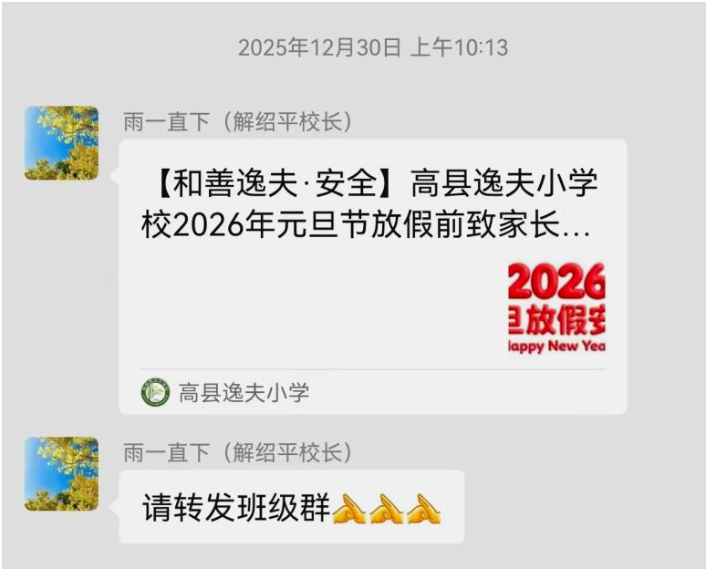 此外,高县逸夫小学校通过家校沟通平台,向全体家长转发《元旦节放假前致家长一封信》,清晰告知假期时间安排与安全注意事项,督促家长切实履行监护职责,与学校携手织密假期安全“防护网”。