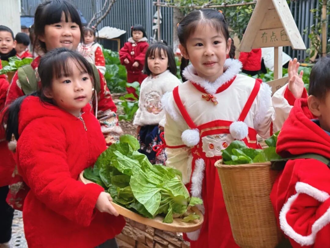 菜地大丰收,萌娃共准备;桌面铺红装,备餐超有样。
