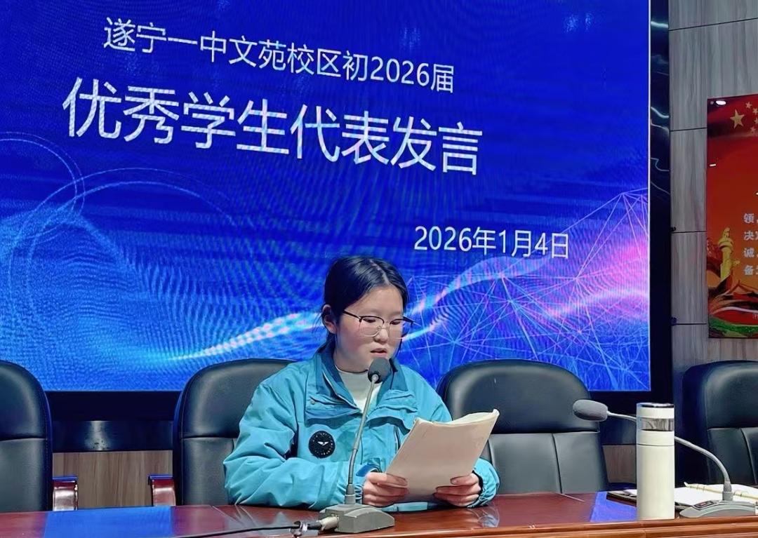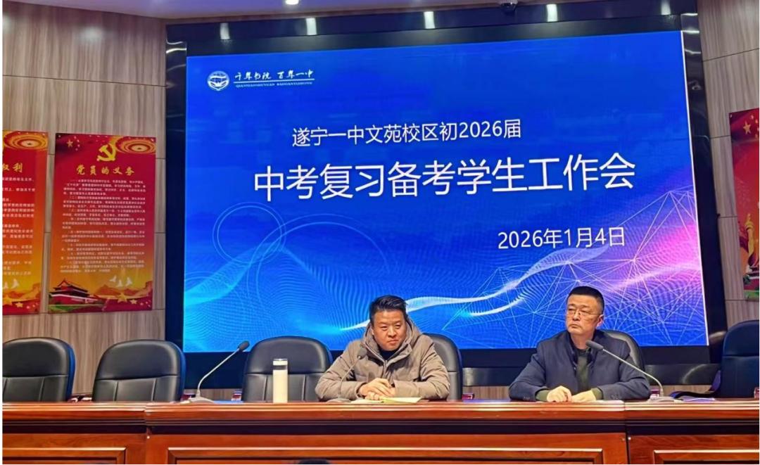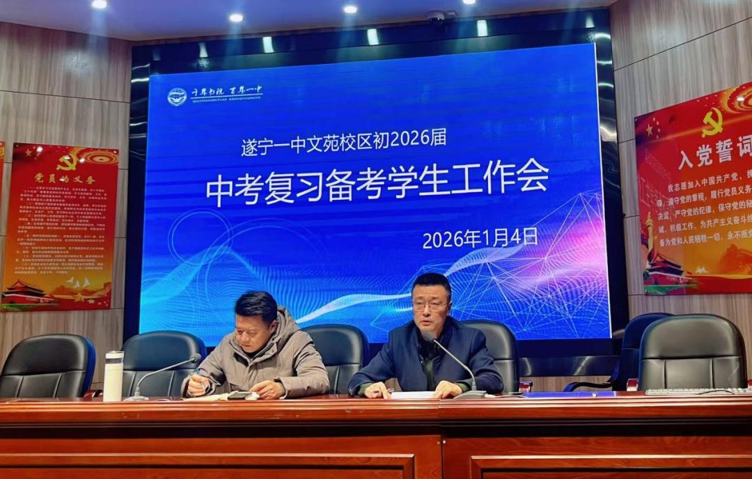 期末铃声渐近,中考号角已鸣!为帮助初 2026 届学子明确备考方向、凝聚奋进力量,2026 年 1 月 4 日,遂宁一中在文苑校区多功能厅召开中考备考工作学生会。教师代表与学生代表共计 220 余人齐聚一堂,在干货满满的分享与指引中,共同吹响冲刺期末、迎战中考的集结号!