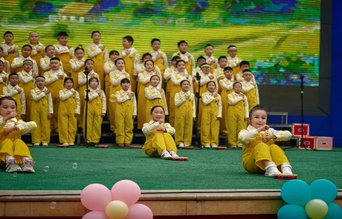 《小美满》以细腻的旋律和治愈的歌词著称,4.9班的同学演绎中,融入了儿童视角的巧思:用清脆的童声在编曲中加入铃鼓乐器,将“日常小美好”与“家国大幸福”巧妙联结,让歌曲增添了童真烂漫的气息。表演时,同学们身着统一的浅黄色色系演出服,配合着轻快的肢体动作,将对生活中细碎美好的感知、对家国安宁的喜悦通过歌声娓娓道来,台下观众不时报以轻柔的掌声,现场氛围温馨又动人。