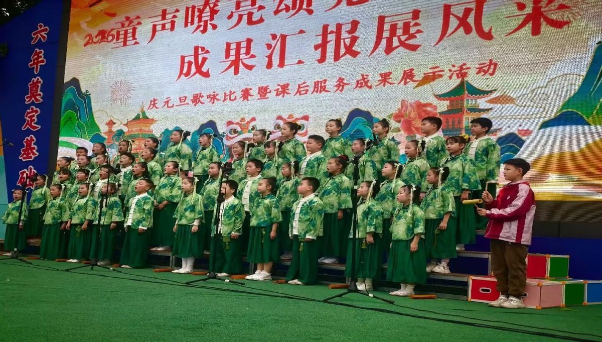 比赛现场,校合唱队率先带来《春日》《螃蟹歌》拉开序幕,稚嫩又洪亮的歌声瞬间点燃全场氛围。随后,各班级依次登台表演,《祖国赞歌》《把未来点亮》唱出了对祖国的赞美与对未来的憧憬,《小小的一粒沙》《半生雪》等曲目以多样的曲风展现了孩子们的童真与朝气。