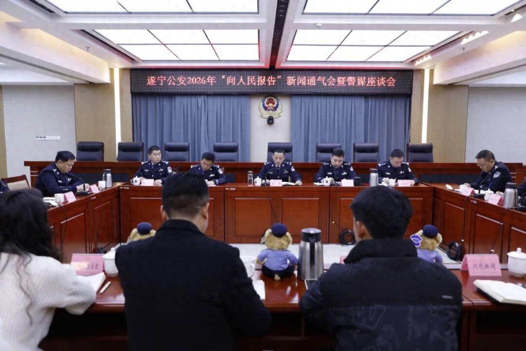 1月7日上午,遂宁市公安局召开“向人民报告”2026年新闻通气会暨警媒座谈会,回顾遂宁公安2025年的坚实足迹、奋斗征程。会议邀请中、省级驻遂媒体以及本地主流媒体代表参加,市公安局党委委员、政治部主任聂洪出席会议并讲话,市局情指、治安、刑侦、网安、交管、经侦、法制、环食药侦、森林公安等部门主要负责同志参加会议并通报2025年全市公安机关打击犯罪、服务群众、护航发展的有关情况。