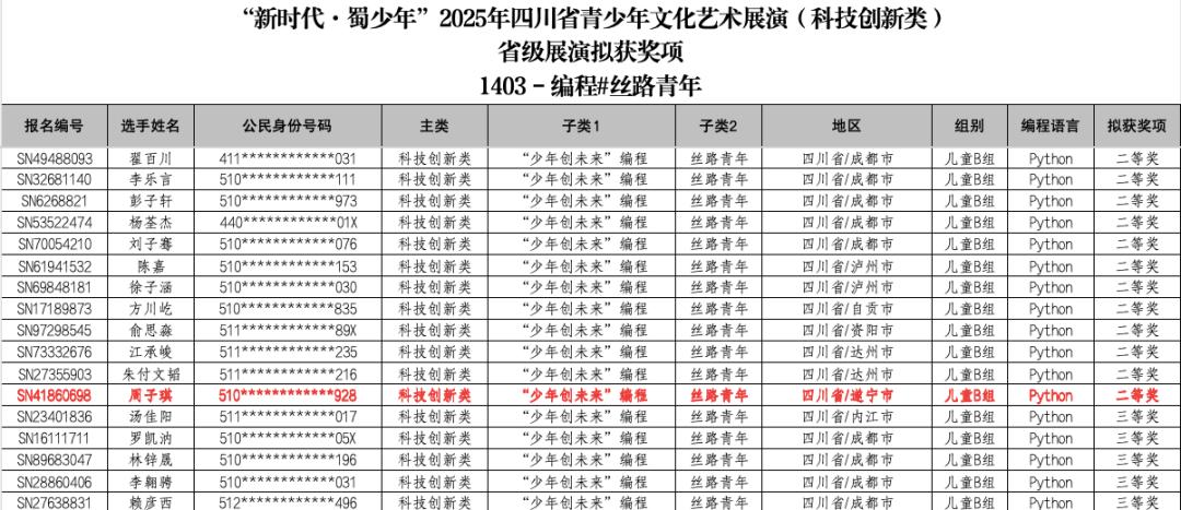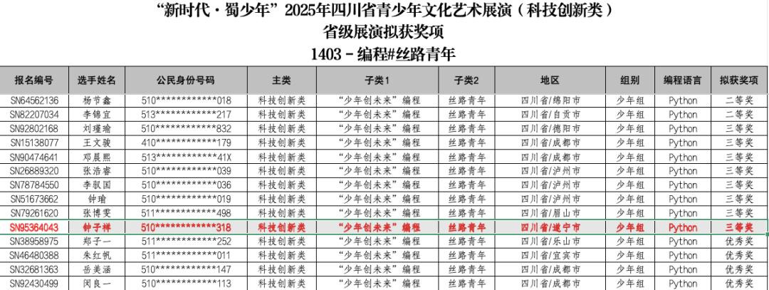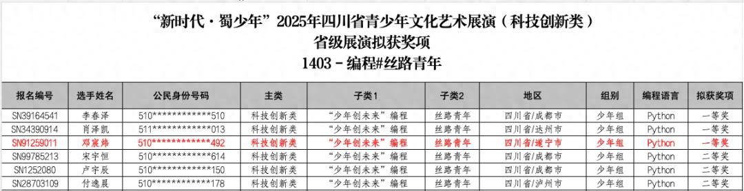 热烈祝贺遂宁一中4名学子在“新时代蜀少年”2025年四川省青少年文化艺术展演科技创新类竞赛中斩获佳绩!其中,邓宸炜同学在竞赛中荣获省一等奖,代宇航、周子琪同学荣获省二等奖,钟子祥同学荣获省三等奖!