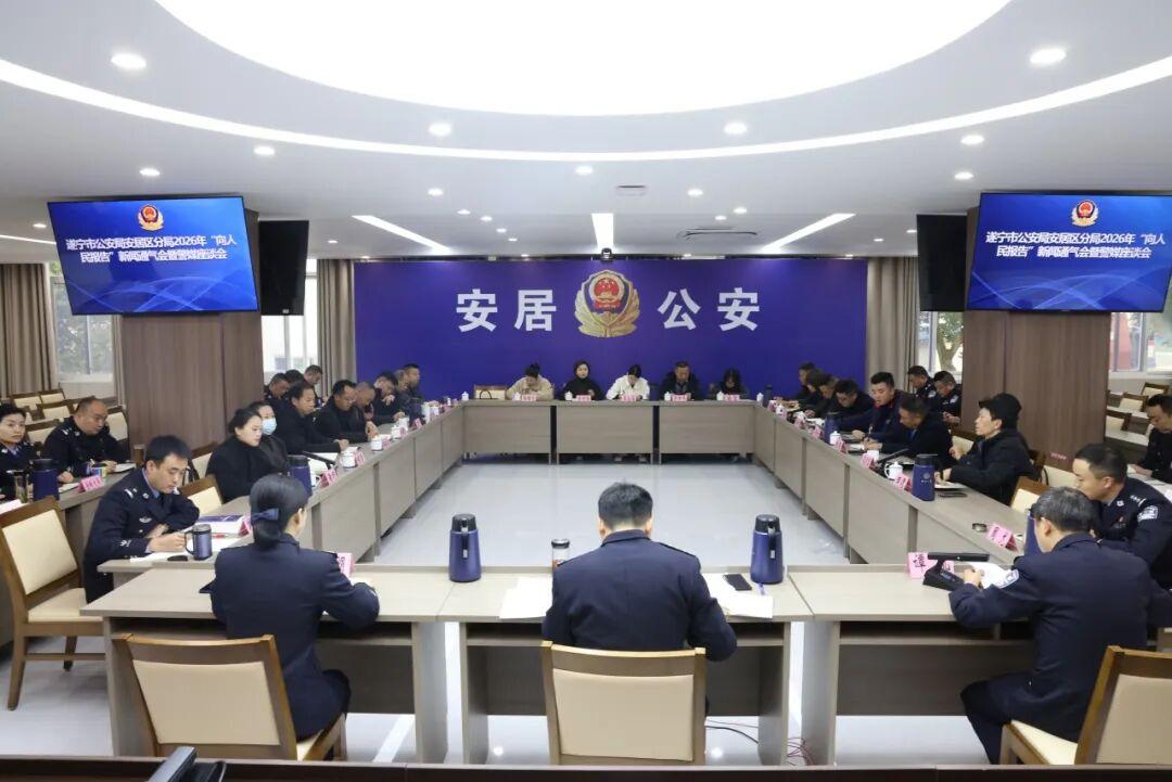 2026年1月7日,遂宁市公安局安居区公安分局召开“向人民报告”新闻通气会暨警媒座谈会。会议邀请人大代表、政协委员、警风警纪监督员、社区及企业代表、媒体代表等社会各界人士共同参与,向社会公开报告2025年度公安工作成效,听取宝贵意见,展望新一年的工作。副区长、局党委书记、局长段勇强出席会议并讲话。会议由分局党委副书记、政委黄子娟主持。