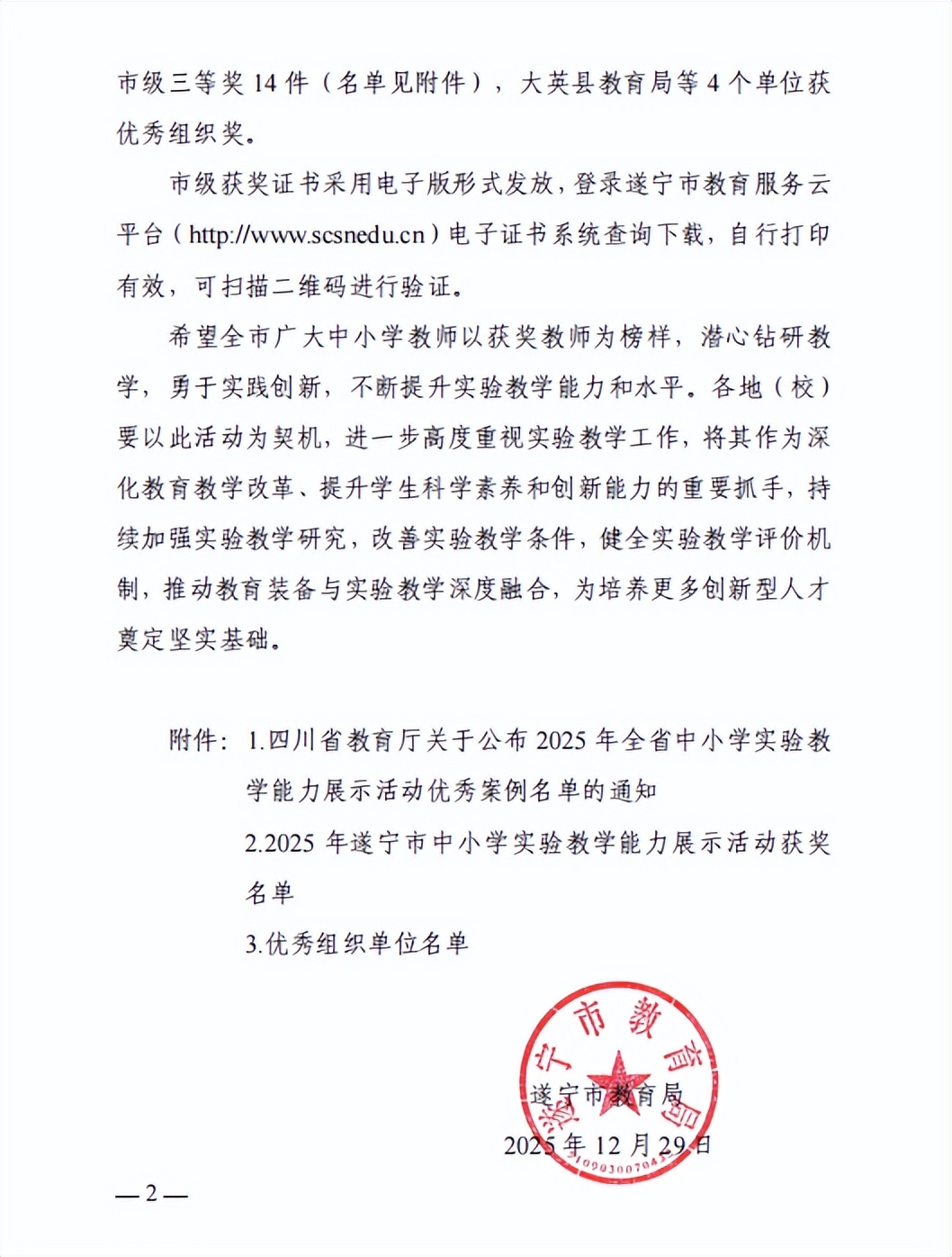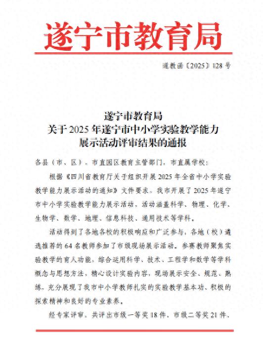 热烈祝贺遂宁一中高中化学教师陈思宇、初中物理教师刘显洋荣获2025年遂宁市中小学实验教学能力展示活动一等奖;通用技术教师雷珺荣获该活动二等奖;学校在这次活动中被评为“优秀组织单位”!