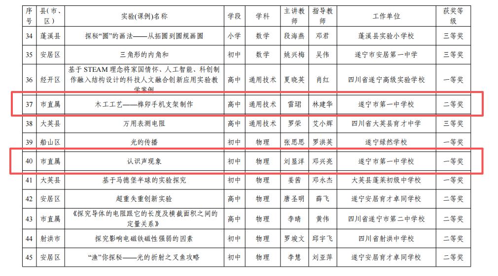 此次佳绩的取得,充分展现了学校教师扎实的教学功底与创新的实验教学能力,也体现了对实验教学与教师专业发展的高度重视。这既是一份荣誉,更是一份动力。 接下来,学校全体教师将以此为契机,继续深耕教学、勇于创新,携手并进, 为持续提升学校教育教学质量而不懈奋斗!(来源:遂宁一中)
