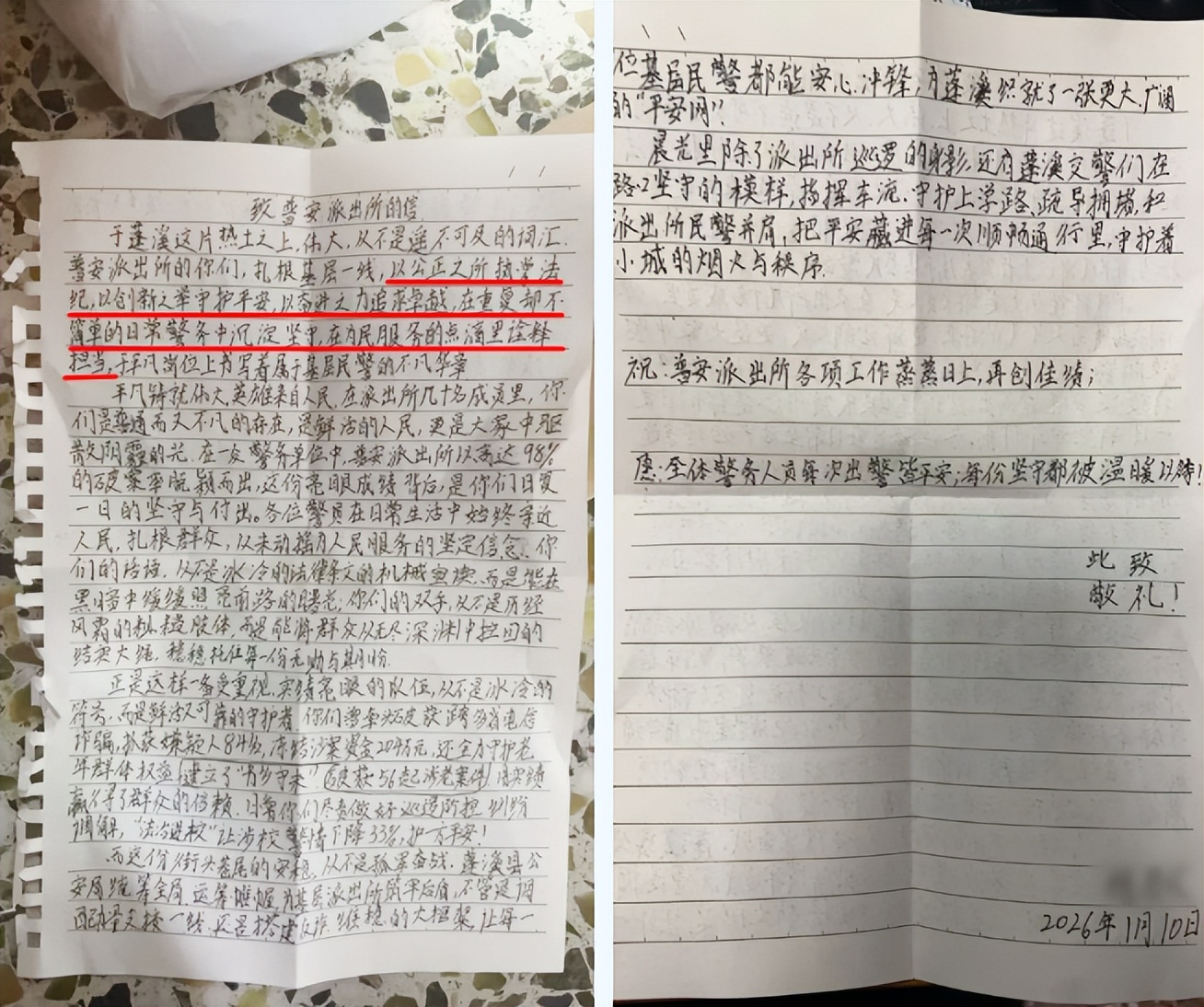 信件中,孩子们不仅送上节日祝福,更用稚嫩而真挚的笔触,记录下他们对公安工作的观察与理解:“你们公正执法、创新守护、奋进追求,在日常警务中沉淀坚守,在为民服务中诠释担当。”信中特别提到了派出所的工作成效——突出的破案率、为群众挽回的经济损失、对“一老一小”群体的用心守护,以及持续开展的“法治进校园”活动带来的校园警情下降。这些都被群众看在眼里,记在心上。