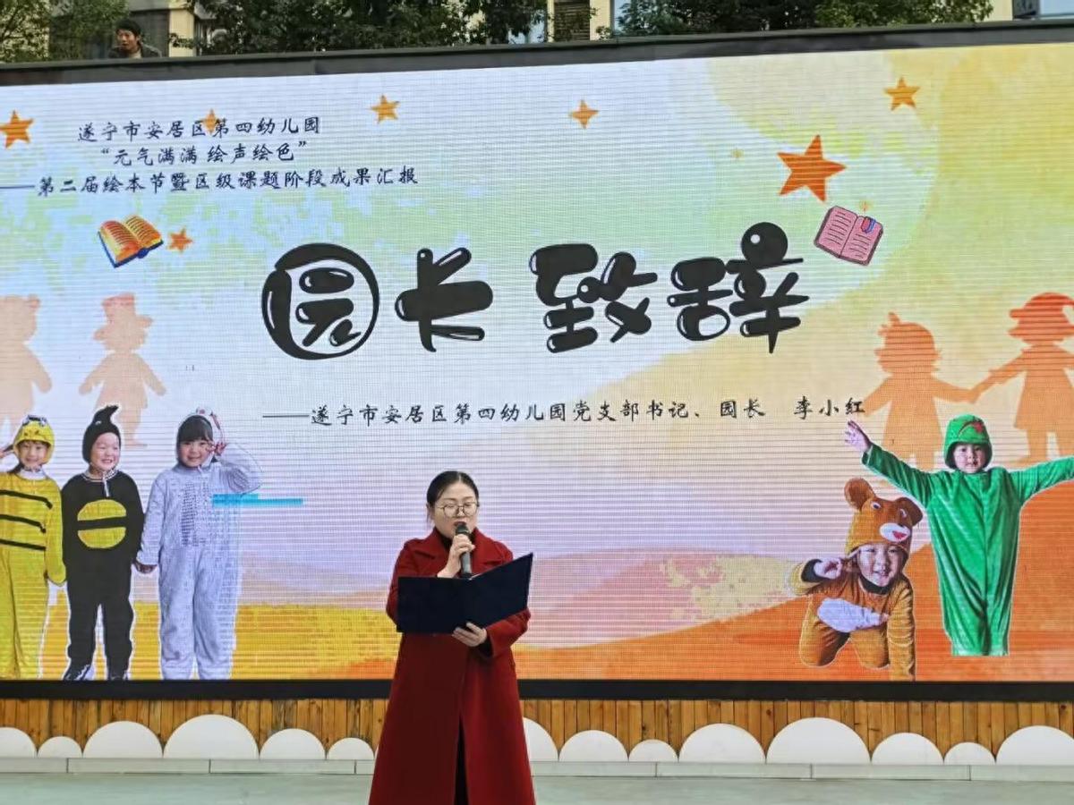 活动伊始,庄严的升旗仪式为本次盛会拉开了序幕。随后,安居四幼党支部书记、园长李小红上台致辞,她以热情洋溢、诚挚亲切的态度向各位来宾和全体师幼表示了热烈的欢迎,也表达了对本次活动圆满成功及未来携手共进的殷切期许。特邀嘉宾书院沟社区党支部书记曾祥林上台讲话,他高度肯定了幼儿园在绘本阅读推广和书香校园建设方面所付出的不懈努力,并表达了对孩子们在阅读中健康快乐成长的美好祝愿。