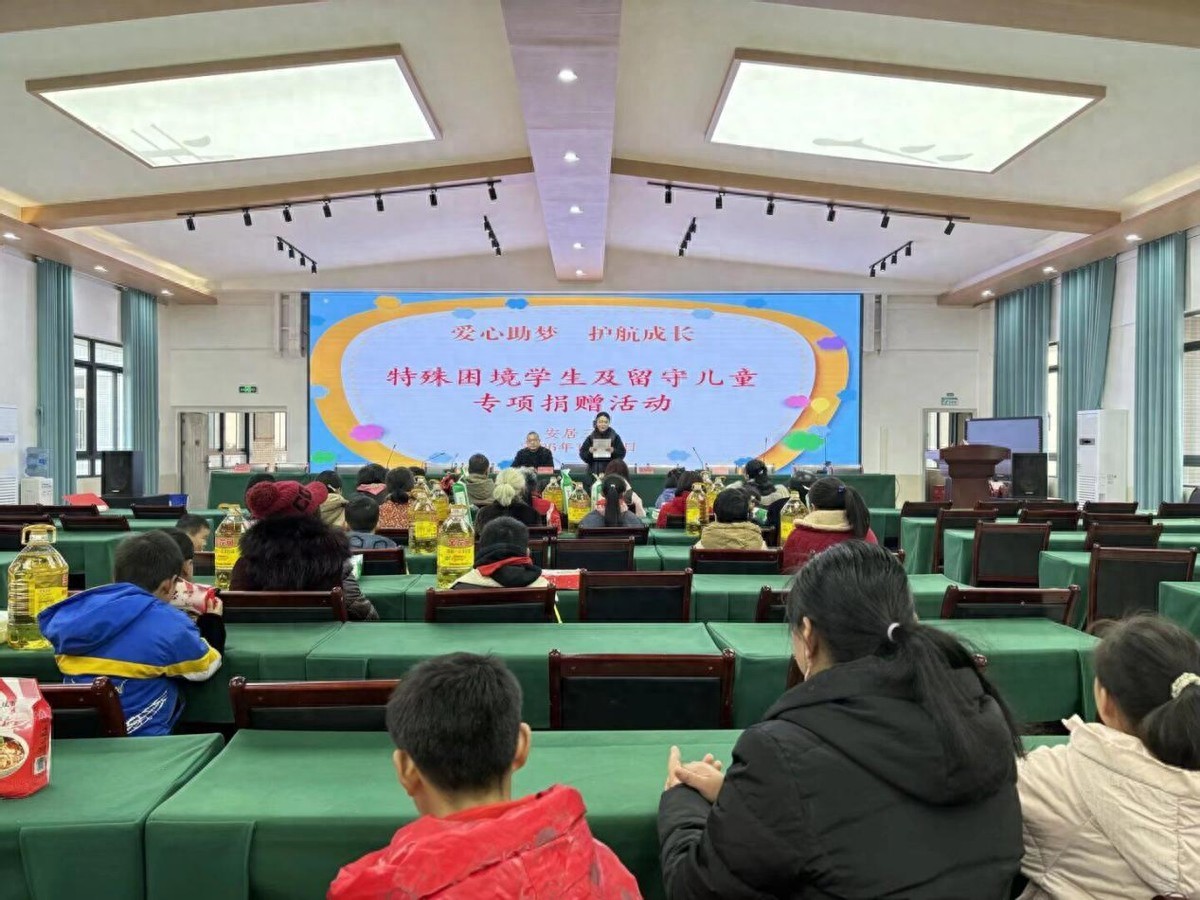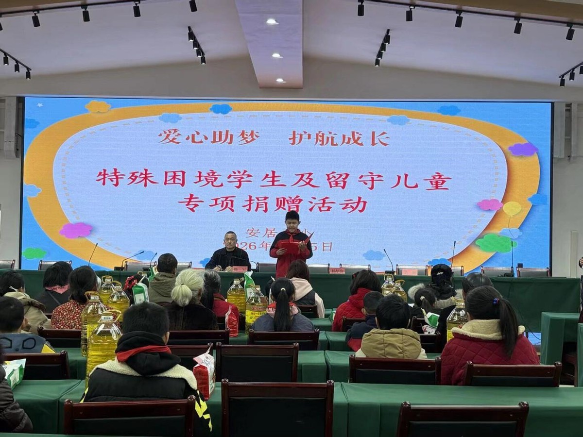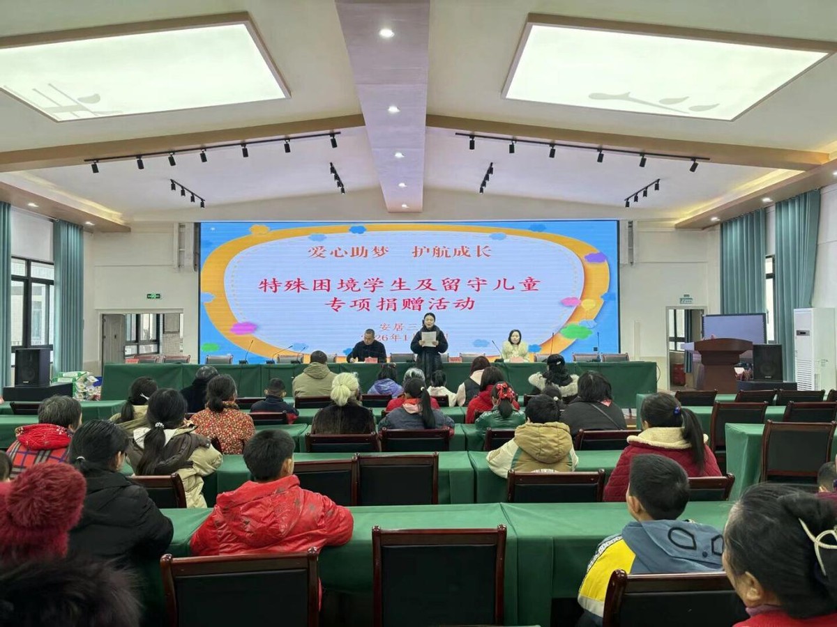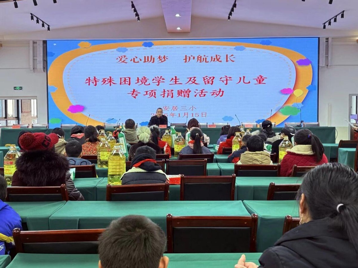 1月16日上午9时,遂宁市安居区第三小学校D401室内暖意融融、爱心涌动,“爱心助梦,护航成长”特殊困境学生暨留守儿童物资捐赠活动在此温馨举行。学校师生、家长代表与社会爱心力量齐聚一堂,共同为孩子们送上冬日的温暖与关怀。