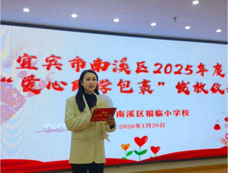 冬日校园暖意融,爱心包裹点希望。2026年1月20日上午,宜宾市南溪区2025年度“爱心助学包裹”发放仪式在南溪区福临小学校温情启幕。活动由学校副校长万洁主持。
