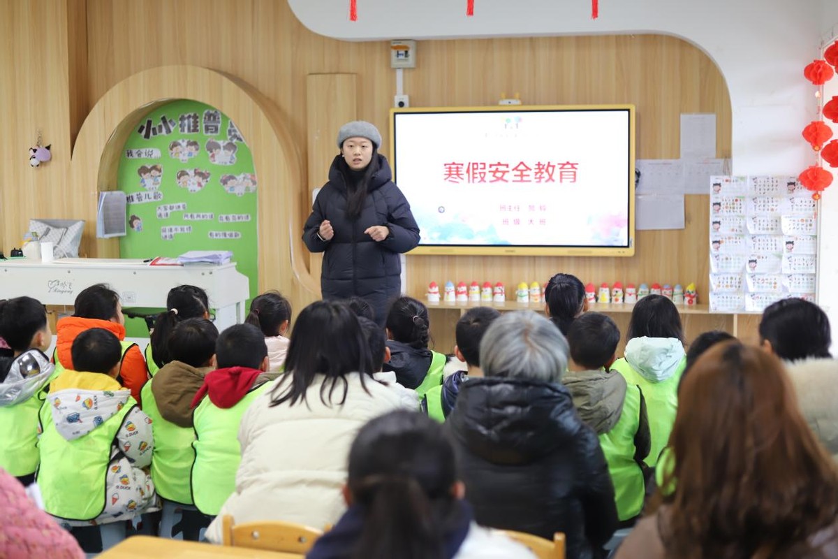 散学典礼上,班主任总结幼儿学期表现、回顾各类活动,汇报孩子成长变化,并结合《指南》明确下学期科学、语言领域教学重点;各班主任现场展示幼儿五大领域学习成果,随后副班老师带领幼儿分年龄段开展户外体育游戏,各岗位分工协作、井然有序;家长会中,重点强调寒假安全与习惯养成,明确放假及开学报名时间,为幼儿发放期末大礼包,全体拍摄班级合影,家长签订离园责任书后有序离园。