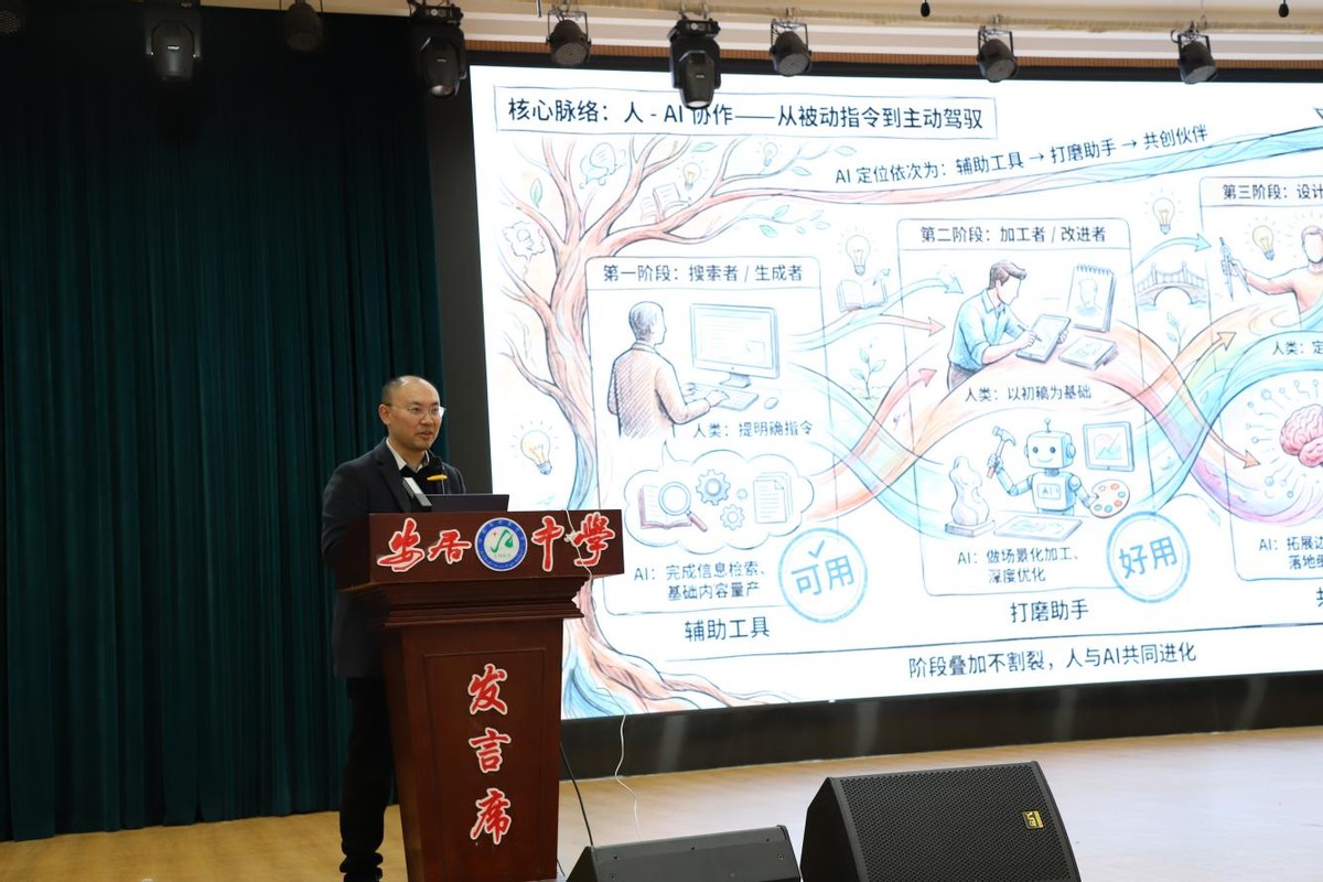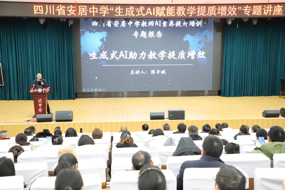 1月22日,安居中学特邀专家陈子斌带来题为“生成式AI助力教学提质增效”的专题分享。全校教师齐聚一堂,共同探索人工智能与教育教学融合的新路径。