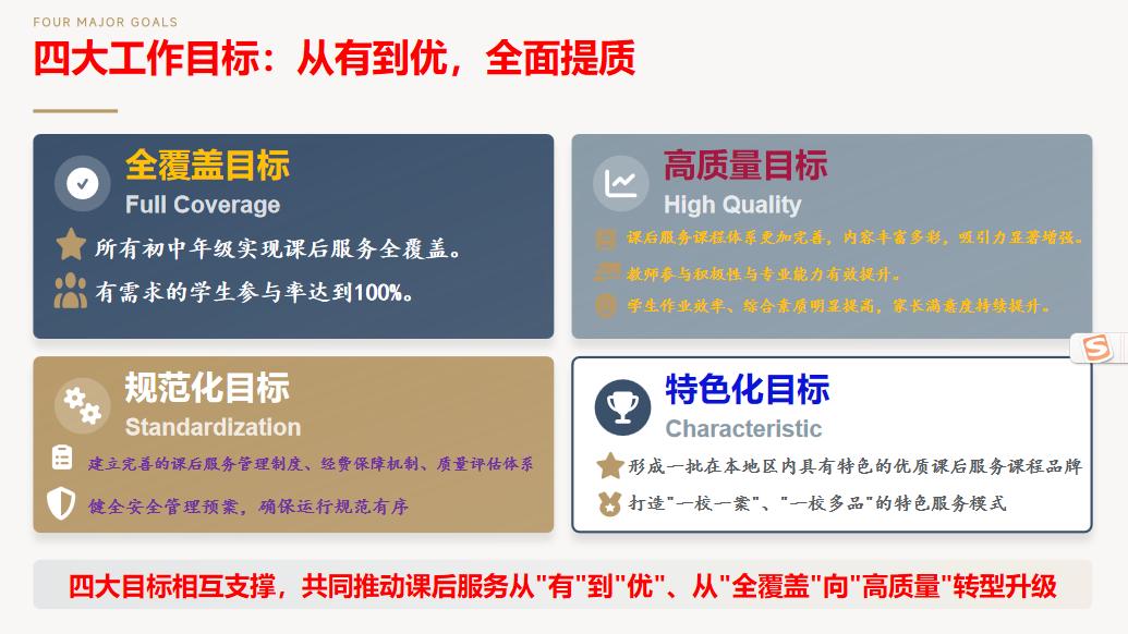 一是实现从“有”到“优”,从“全覆盖”到“高质量”的转型。锚定了四大工作目标,优化了三级管理架构,致力于增强教师课程开发及服务的目标性,提升过程管理效能。