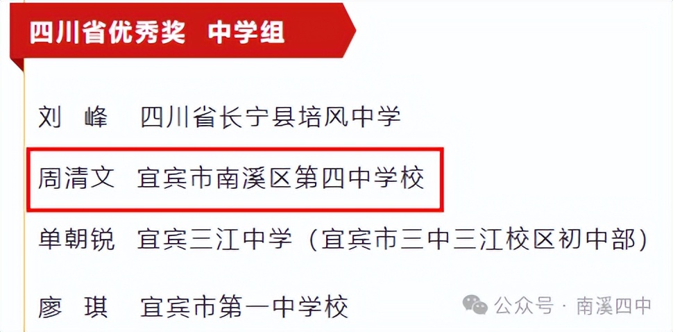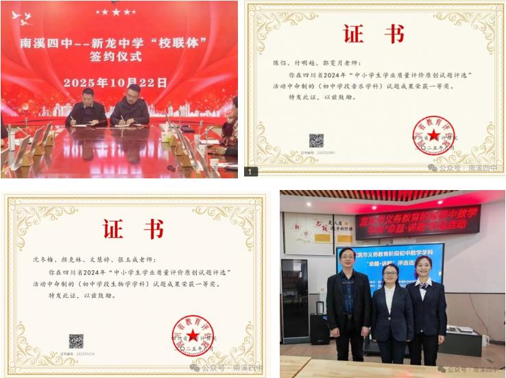 南溪区第四中学校致力于搭建多元成长平台。骨干教师培训、教研组长(赴重庆)培训、种子教师培训、跨区域教研交流(如与甘孜新龙中学的“全域结对”)、课题研究等活动蓬勃开展,“AI赋能初中班主任快速生成‘社交焦虑’个体辅导谈话提纲的实践研究”“依托初中心理辅导室开展青春期学生心理危机预警信息整合与应用研究”两项省级课题立项成功, 教师专业发展捷报频传。在四川省“中小学生学业质量评价原创试题评选”中,陈侣、付明越、郭雯月三位老师命制的音乐学科试题荣获一等奖,沈冬梅、颜克林、文慧婷、张玉成四位教师命制的初中学段生物学科试题荣获一等奖;王耘聪、曹婧、周亚兰三位老师代表南溪区出征,斩获宜宾市初中数学“命题·讲题”评选一等奖;周清文老师在第四届川渝地区青年教师风采大赛中荣获宜宾市一等奖、四川省优秀奖,周清文老师在宜宾市2025年初中语文命题说题比赛荣获二等奖;陈燕老师荣获南溪区中小学美术教师基本功比赛中学组全能二等奖。一支师德高尚、业务精湛、充满活力的教师队伍正在不断壮大。