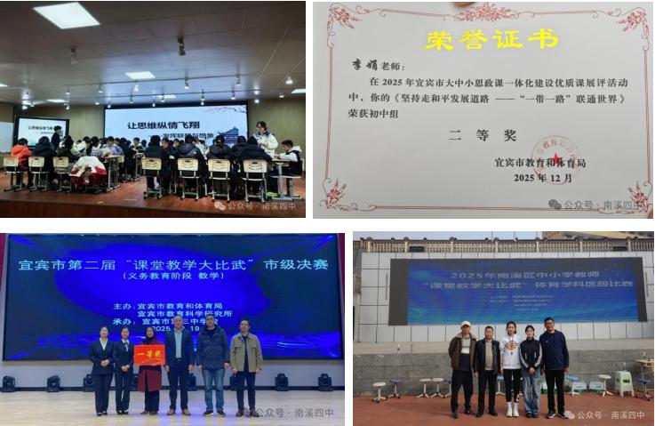 始终坚守课堂核心地位,“推门听课”常态化,以教研促教学,南溪区第四中学校教师在各级平台参赛成果丰硕。卢丽娟老师荣获南溪区语文青年教师课堂教学展评一等奖;周亚兰老师在宜宾市“课堂大比武”决赛中斩获一等奖,王耘聪老师获评优秀指导奖;思政课建设取得突破,李娟老师的微课在市级“大中小思政课一体化建设优质课展评”中荣获二等奖;体育学科团队在区级“课堂大比武”中获二等奖。这些成绩彰显了南溪四中课堂教学改革的深度与实效,充分彰显了南溪四中教师队伍扎实深厚的专业素养与协同共进的教研文化。