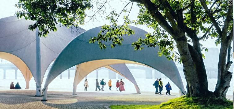 直到2024年冬天的一个下午,当他信步走到遂宁摩天轮下,透过大树阴影,看到膜结构建筑下晒太阳的人们,心头豁然开朗——“觉得这个场景就是我心中想象的那个画面”。