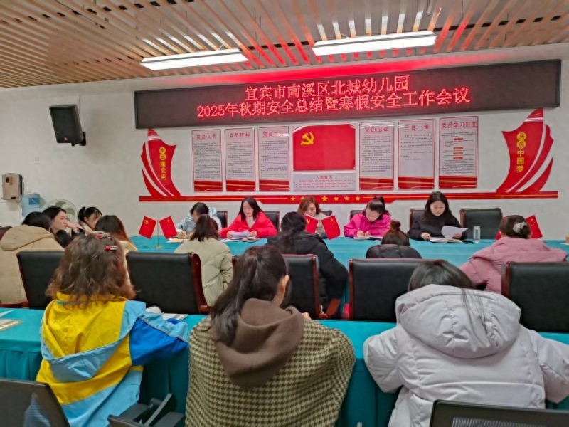 会议由南溪区北城幼儿园教务主任董文学主持,全体教职工参会。该园各部门工作进行总结;首先,该园安保主任围绕校园防疫、食品安全、幼儿活动安全等各个方面复盘成效与不足,并对寒假期间的居家安全、出行安全等重点事项进行提醒;随后,该园德育、教务、后勤、工会及党建工作依次进行总结,分别从幼儿德育养成、教学教研推进、后勤服务保障、工会人文关怀及党建引领成效等维度,总结秋期工作亮点与改进方向;最后,该园园长陈娟对秋期整体工作进行全面总结,肯定了全体教职工的辛勤付出,结合各部门汇报提出了针对性的优化建议,并重点强调了寒假期间的值班值守、隐患排查及家校联动等安全要求。