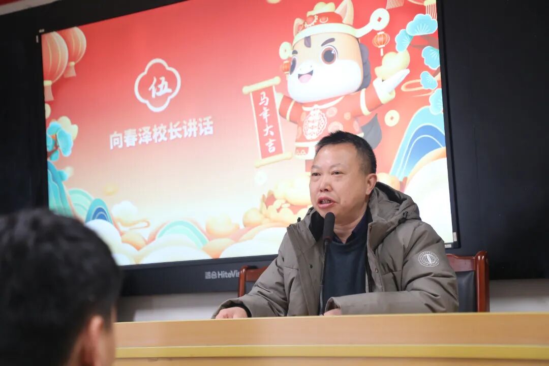 校长向春泽对本学期全校工作进行全面复盘与系统总结,充分肯定全体教职工在教育教学、学生管理、文化建设等各方面取得的成绩。他强调,面对新时代教育发展的新要求和新挑战,全体教职工要以问题为导向,补齐短板,在深化课堂改革、加强师资队伍建设、优化育人环境等方面持续发力。同时,他叮嘱全体教师,假期要坚守安全底线,平安过节;要恪守师德,言行雅正,坚守育人初心;要坚持学习反思、适度充电,积蓄专业成长动能;要兼顾陪伴家人与体育锻炼,度过一个劳逸结合的假期。