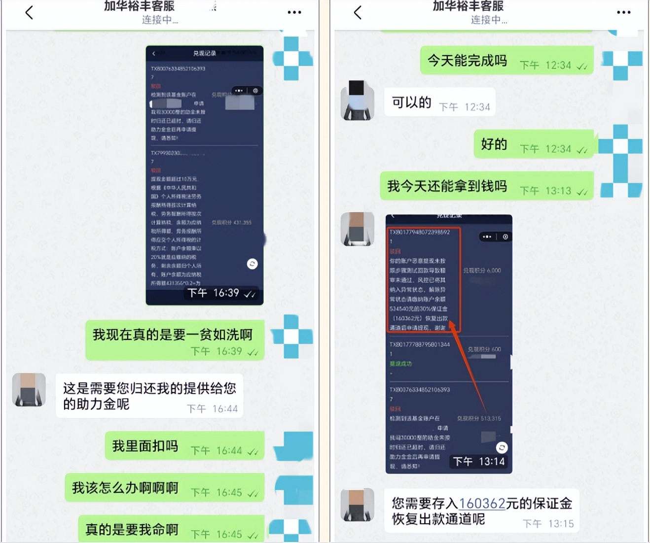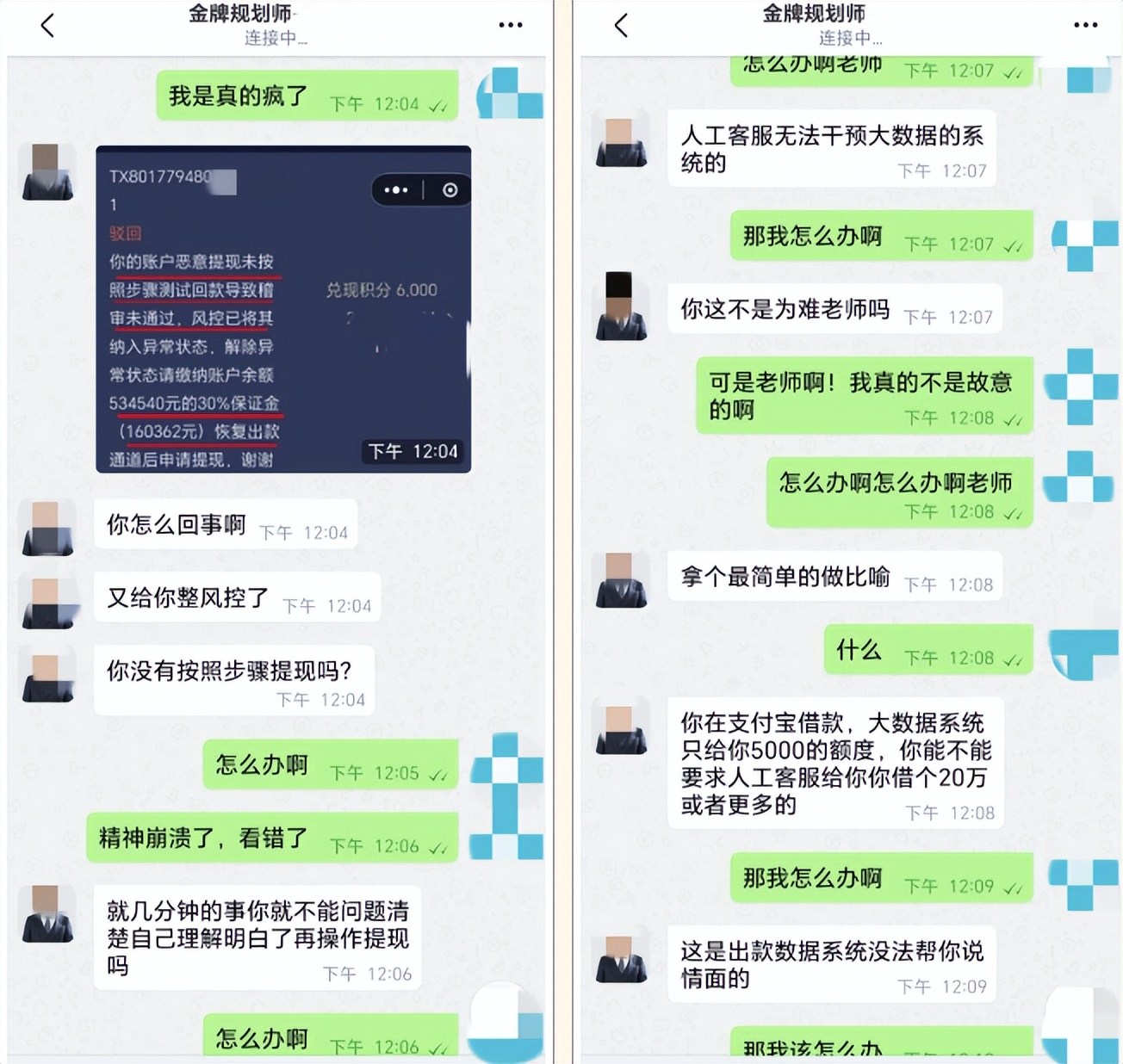 期间,杨先生曾因资金不足表示无法继续,“客服”和“金牌规划师”不但没有收手,反而怂恿他去各个网贷平台借款,或向亲友借钱,甚至“好心”为其申请了3万元基金助力金。与此同时,还将过错完全推给杨先生,指责其操作马虎、害老师被罚,利用心理控制进一步加深其信任与焦虑。