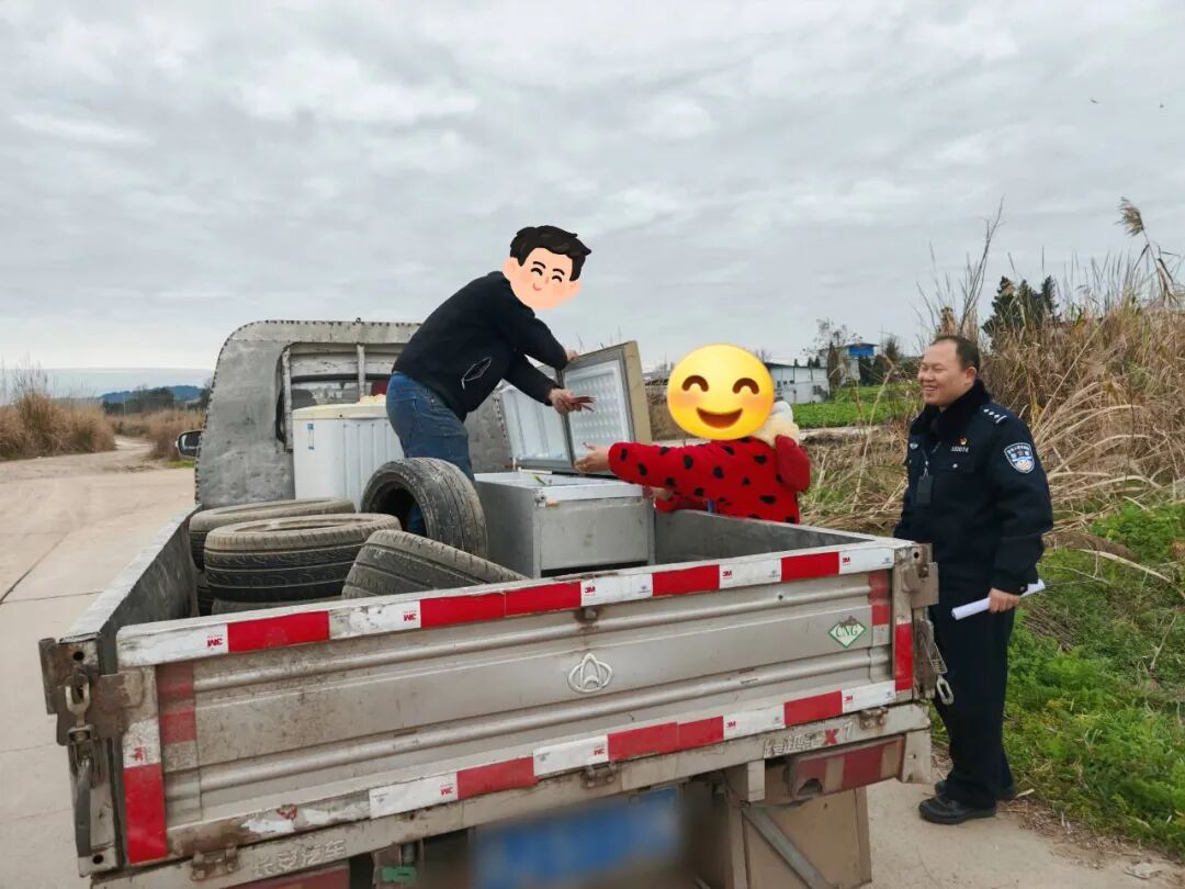 经过几番周折,民警终于成功联系上回收旧冰箱的商贩。电话中,民警说明情况后得知对方正在洪江村附近,且冰箱尚未处理。“我们马上过来,请您稍等!”挂断电话,三人来不及多想,连警帽都没顾上戴,便立即驱车赶往现场。