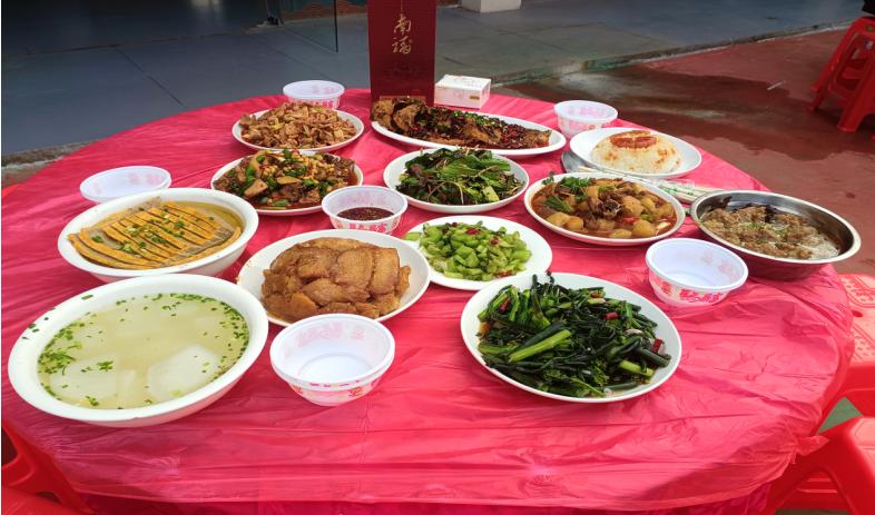 与此同时,活动场地的另一方,是一派忙碌景象。本地村民组长身穿志愿者马甲,在临时灶台前掌勺,其他志愿者各司其职,洗菜、熬汤、斩鸡、装盆、盛菜、打饭……一个个忙得不亦乐乎。