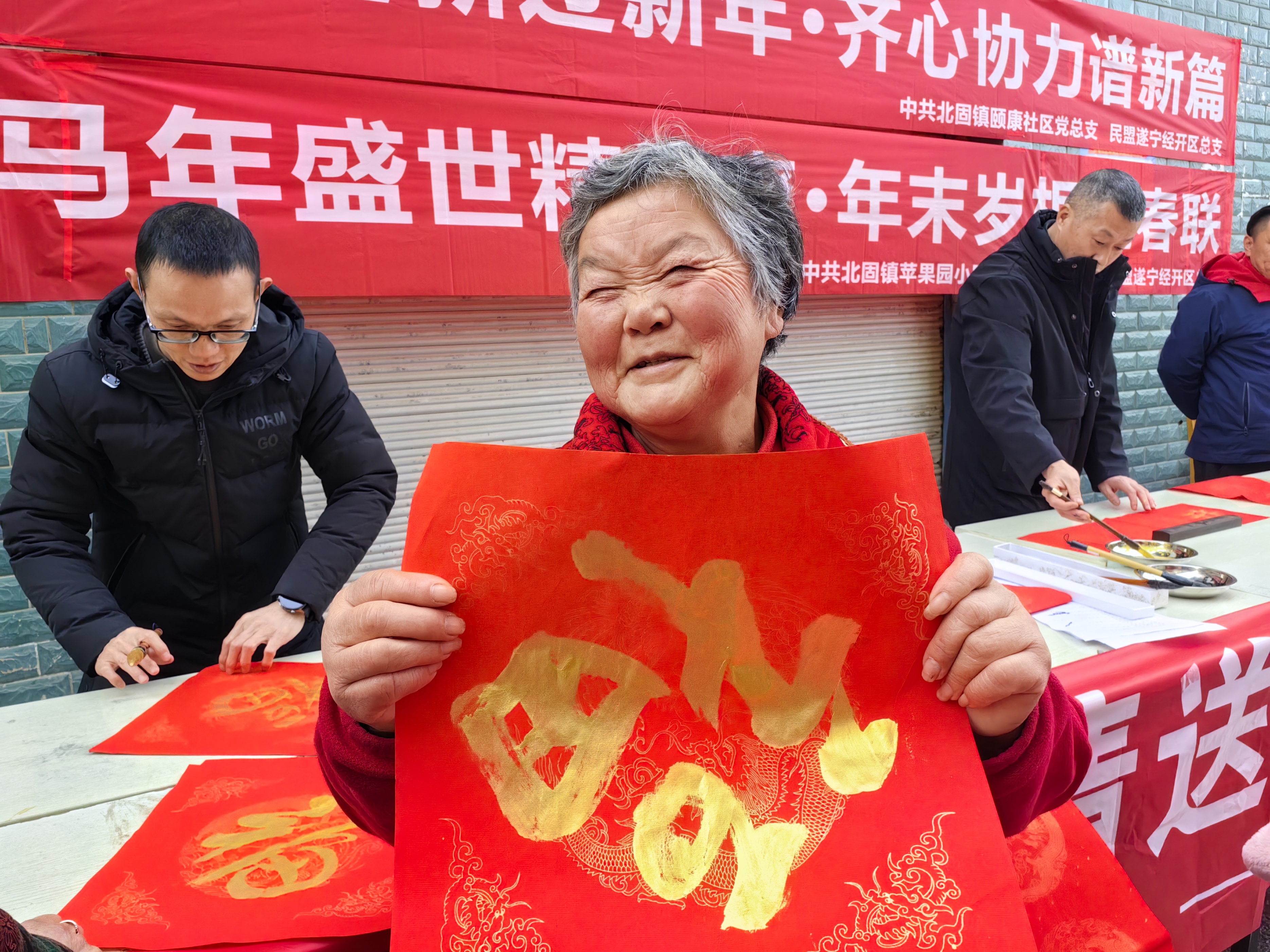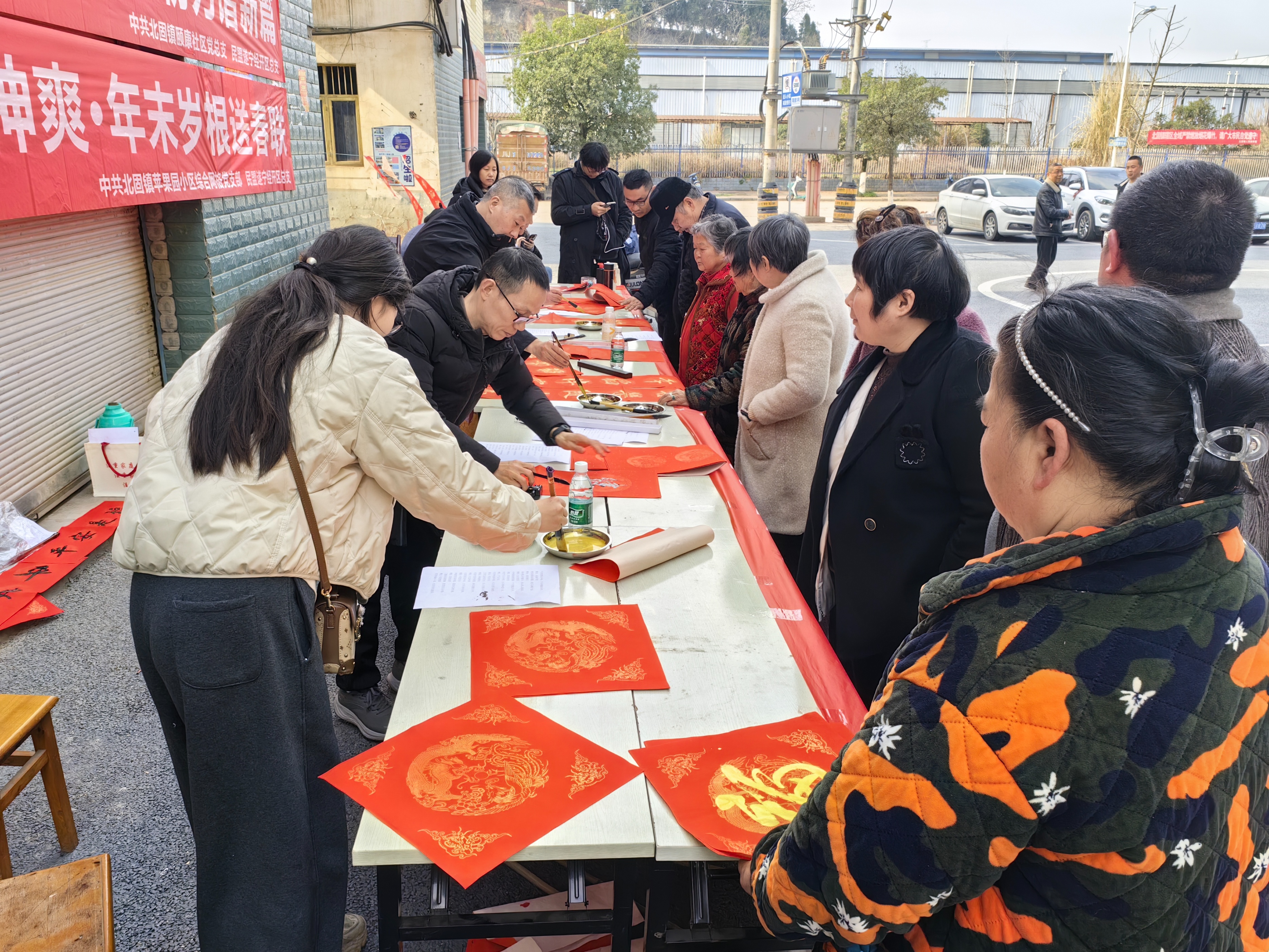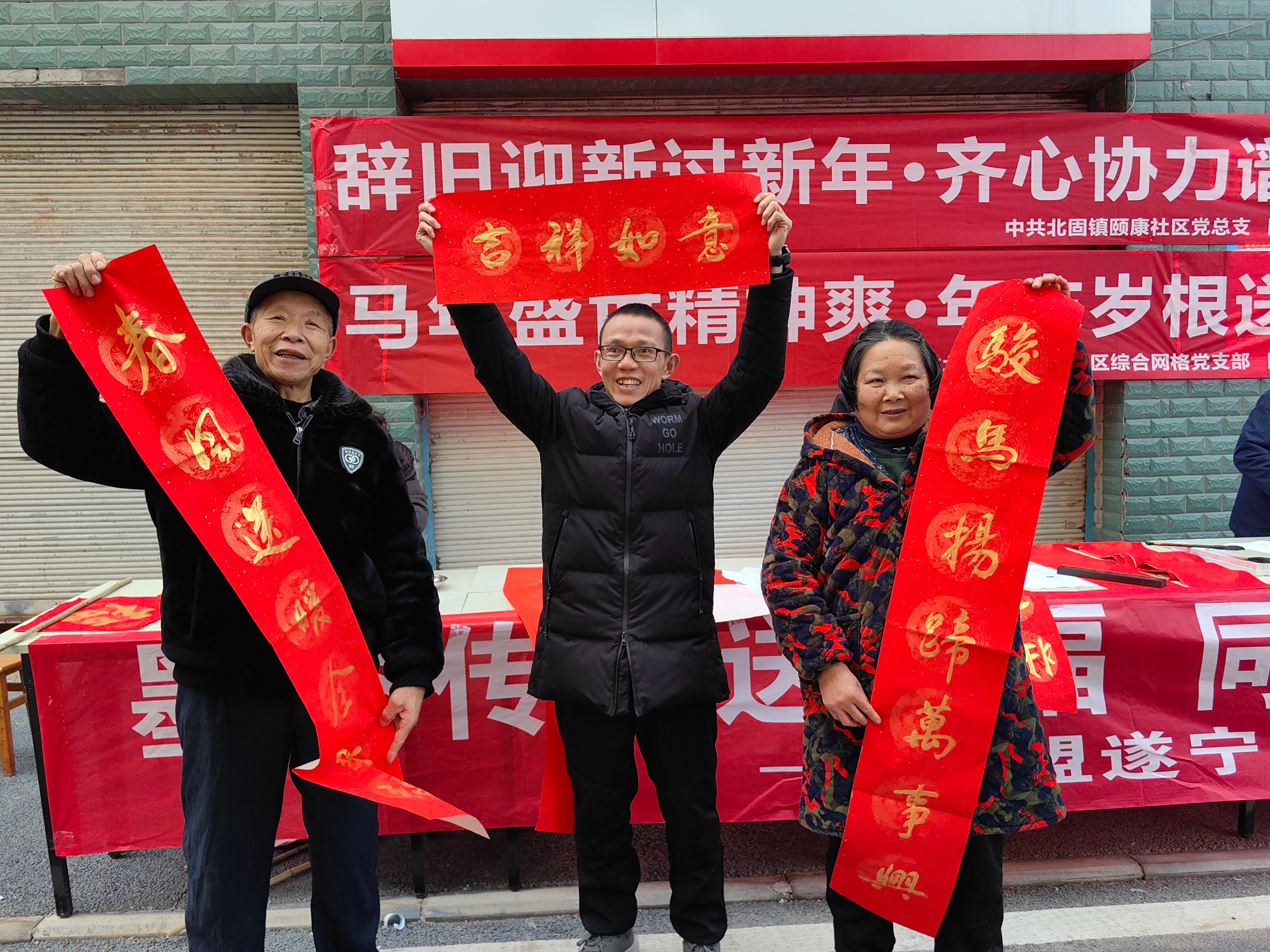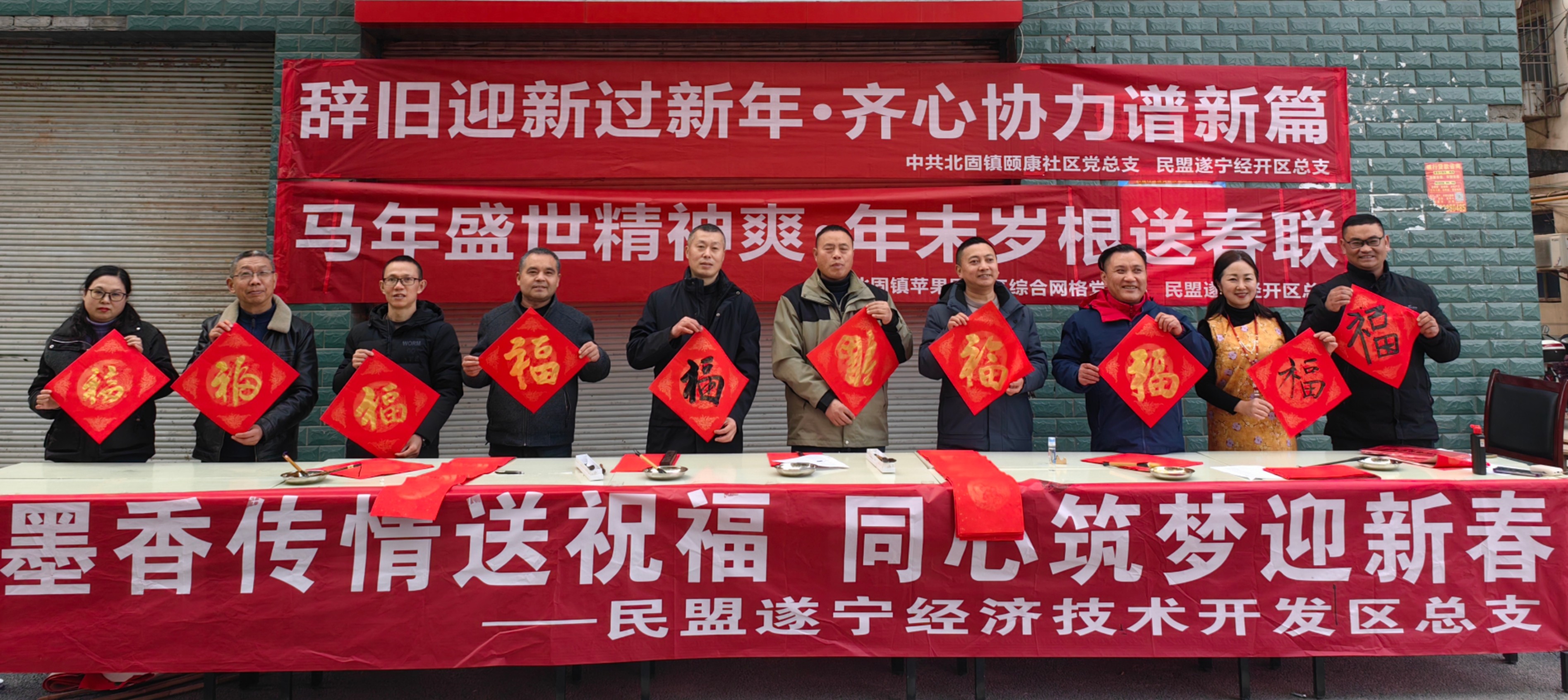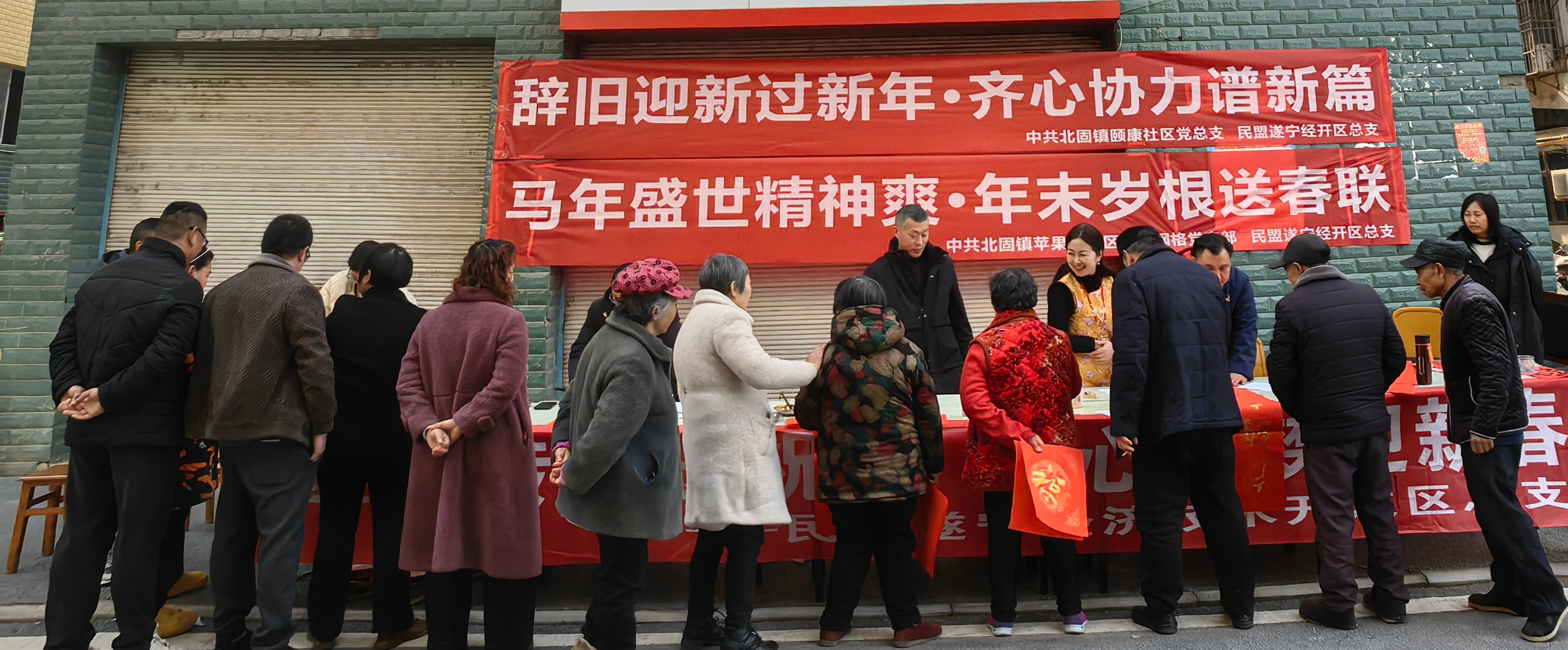 为弘扬中华优秀传统文化,丰富居民精神文化生活,营造喜庆祥和的节日氛围,2026 年 2 月 10 日下午,民盟遂宁经开区总支主办,中共颐康党总支、中共北固镇苹果园小区综合网格党支部承办的 “马年盛世精神爽・年末岁根送春联” 文化惠民活动,在苹果园小区 1 栋前广场温情举办。颐康社区全体居民、社区工作人员与网格员共同参与,以笔墨传情、以春联送福,让年味与暖意充盈社区。