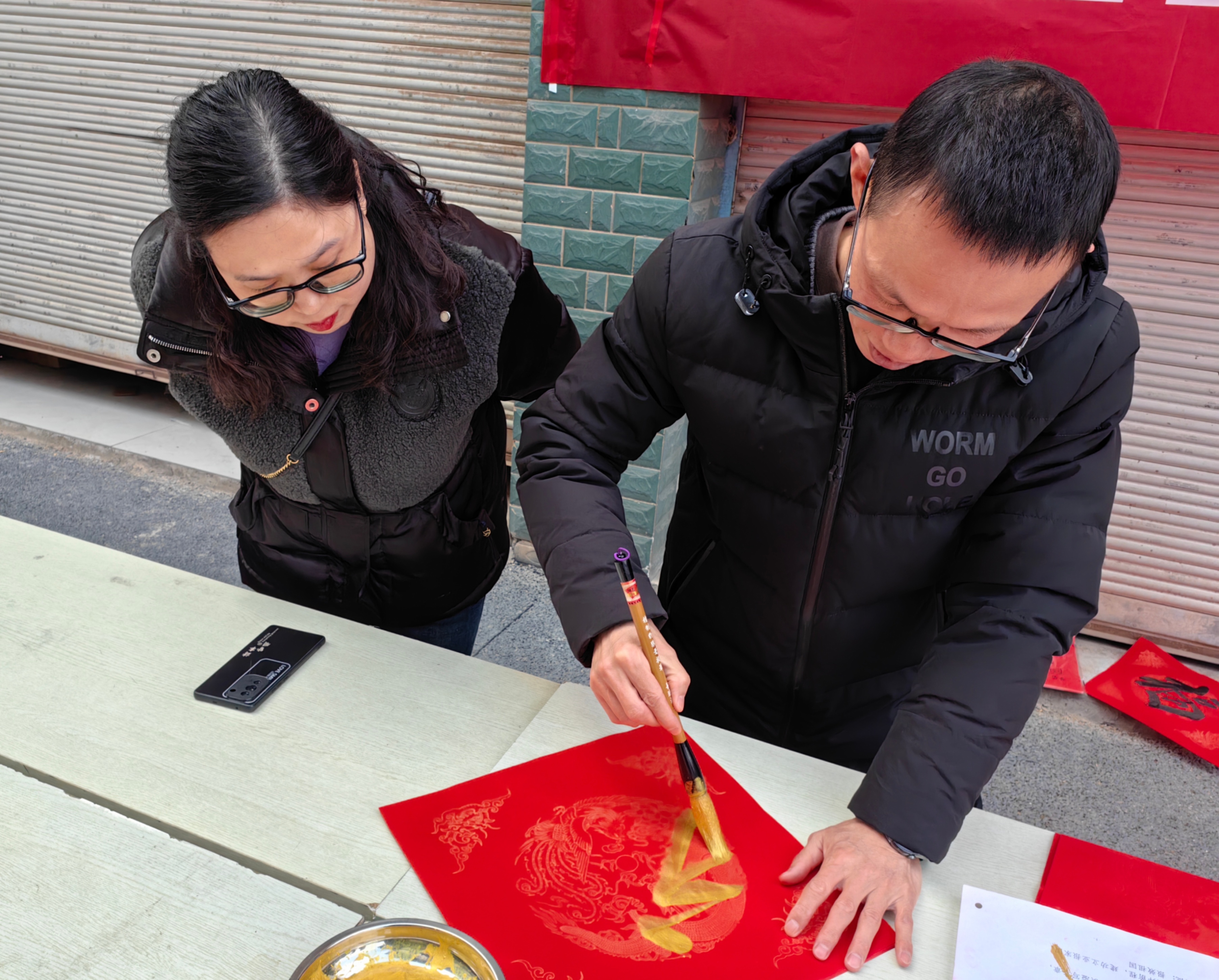 活动现场墨香阵阵、喜气洋洋。社区特邀书法家与辖区书法爱好者在书写区挥毫泼墨,围绕盛世发展、龙马精神、阖家安康、马年启新等主题,为居民免费定制春联与福字。传统经典联与原创精品联相映成趣,红底黑字承载着新春希冀与家国祝福,居民有序排队、按需领取,现场洋溢着浓厚的节日气息。