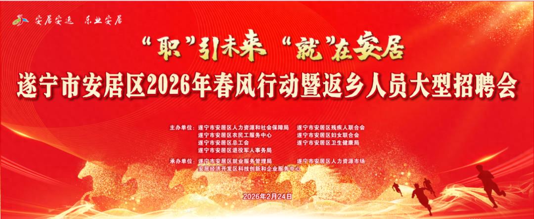 遂宁市安居区2026年春风行动暨返乡人员大型招聘会将于2月24日上午9:00在安居区头陀寺广场举行。