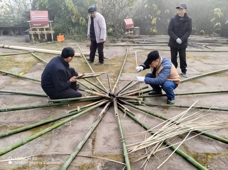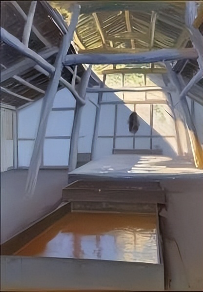 先选一向阳、通风、输卤方便的地方,平整成四周略高、中间平,呈条盘形的枝架坝,坝中挖建若干个水池便于分浓分储,池与池用竹制作笕道通连。枝条架的木架,用8cm-10m左右的长条木,不够长度可用二根连接够需要的长度两根一组,捆成上窄下宽、上短下长、剪刀形人字架,两木相互支撑。为了防风,用土埋柱足法,把左右距离,规则、整齐、高矮一致的埋于枝架坝内,架足夯实,再用条木或楠竹连接起来,再把编好的荆竹枝茅扇,从下到上铺挂在木架两面,成为一座长长的“人字蓬”。枝条坝和储卤池的底部,四壁铺填一层厚约20cm的粘性黄泥,夯实后再用板石镶铺于黄泥上,再用水泥填好石板缝和枝架脚,再刷一层水泥浆于石板面上,就成为一个防漏枝坝。