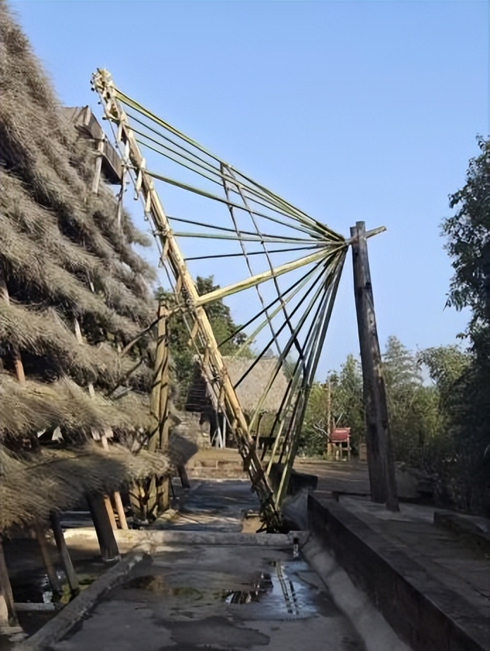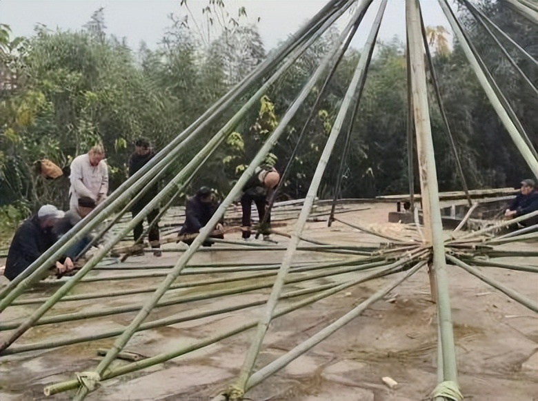 上部木头制天船楻底部用一整根斑竹,打通内节,用“腰担子”办法,接续够枝条架的长度,班竹身一面每隔2cm-3cm左右距离钻一孔,称为“须竿”。顺着枝架顶端,把须竿安放好、系牢,中国传统的水利灌溉筒车被中西合璧的使用与枝条架浓缩卤源,人在筒车内踏板上行走旋转捆绑在筒车边缘上的竹筒则灌满卤源当运动到天楻位置刚刚好就倒入楻内了,蓬溪县与射洪部分区域后来用改进立式踩踏式杨水器,人脚踩抽水板,压卤水上架人天楻桶,须竿入桶处安一活塞(开关),用纯连接成拉线开关。待桶水上满后,下面拉动拉线,活塞开启,卤水便流往须竿,又从须竿孔喷出,洒上枝架,卤水便从荆竹枝上面,重重叠叠曲曲折折慢慢下流,在下流过程中,淡卤水滴自身经受风力、日光的吹晒,蒸发出水份,落下坝内的卤源水便增加了浓度,反复上下、反复蒸发,达到理想的浓度后,再运输送入灶房制煎盐。枝条架浓卤,不仅利用自然气候,提高卤水浓度,节约燃料,还起到清洁卤水,提高盐的质量的作用。川北盐业在民国后期曾经在十大盐场推广使用也证明此方法经济实惠方便简单优于传统泼淋灌灶和制灶倒灶淋小灶等浓缩卤源方式。
