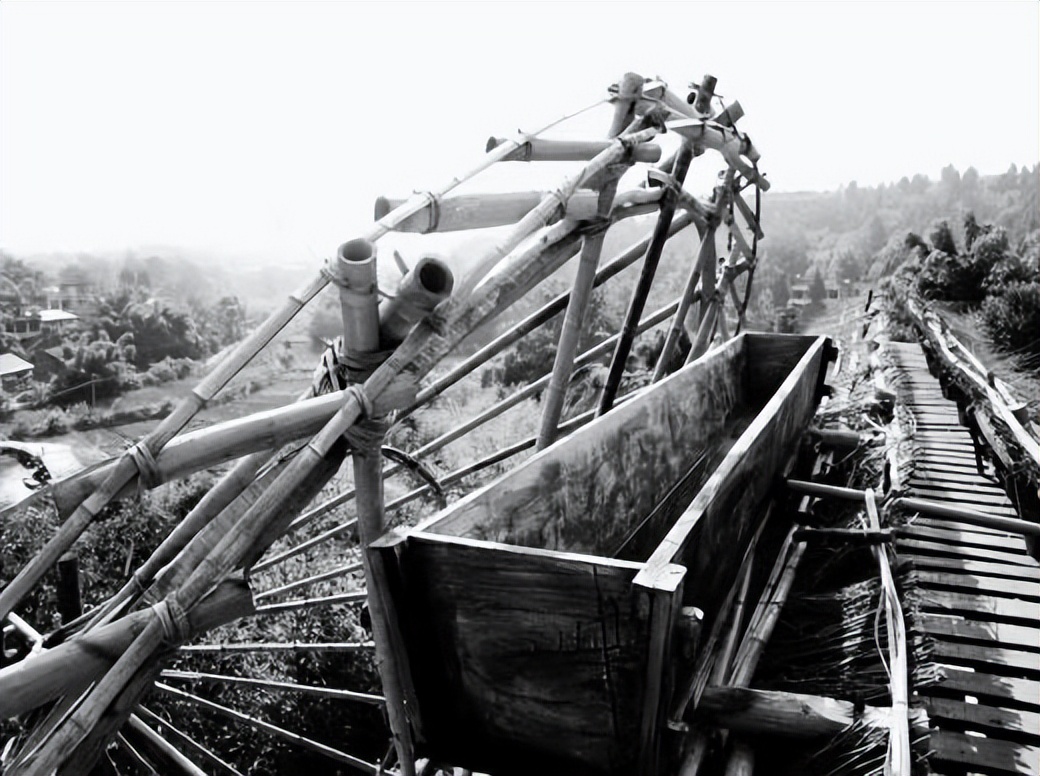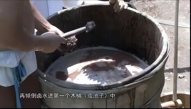 在盐井内将卤水汲出,储存于咸潢或大潢盆内,卤水浓度高者用竹筒枧过滤灰尘碴垢澄清以后,再入盐锅煎熬成盐。