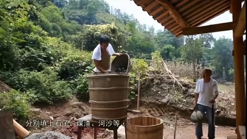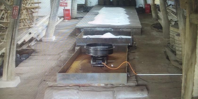 4:为滤水法,每一灶另安置一锅口,其上放置一锅称为漏底锅内盛装草木灰上面覆盖篾笆篱,在温水锅将卤水加热至沸腾后转勺入漏底锅內过滤以滤出杂质,其方法所制之盐色如雪霜。