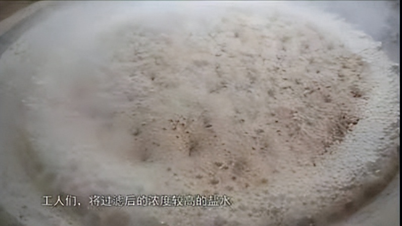 将浓缩了的高浓度盐卤水经潢澄清过滤以后转入温水锅用苦煉子或皂角水提练方能成盐晶颗粒。