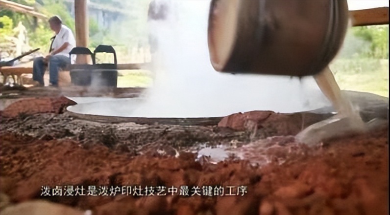 于灶后设垅横架卤土砖中通灶尾烟火重路,砖干色红时又反复用淡卤水泼浸,大概二十天后将此批土砖击碎入潢加新汲卤溶化析出高浓度盐卤,经过滤澄清后煎制为盐。