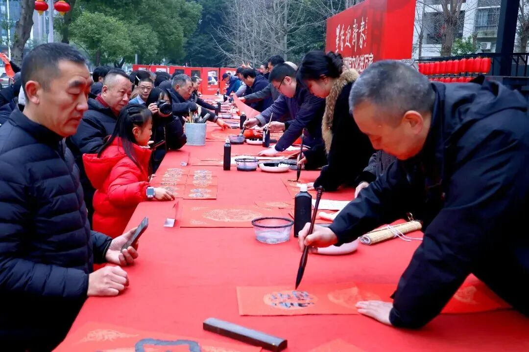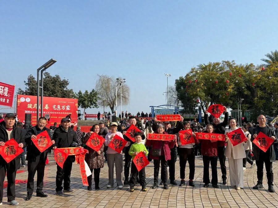 每场活动开场前半小时,最热闹的地方总是那片红纸翻飞的服务区:市书法家协会、市女子书法家协会、市硬笔书法家协会的书法家们挥毫泼墨为群众送上手写福和对联,市摄影家协会的摄影家们忙着为市民拍摄全家福。“手写春联才有正宗年味,专门请老师写了马年吉祥联,给家人讨个好彩头!”在犀牛堤广场,市民郭女士捧着墨迹未干的春联,笑意盈盈。