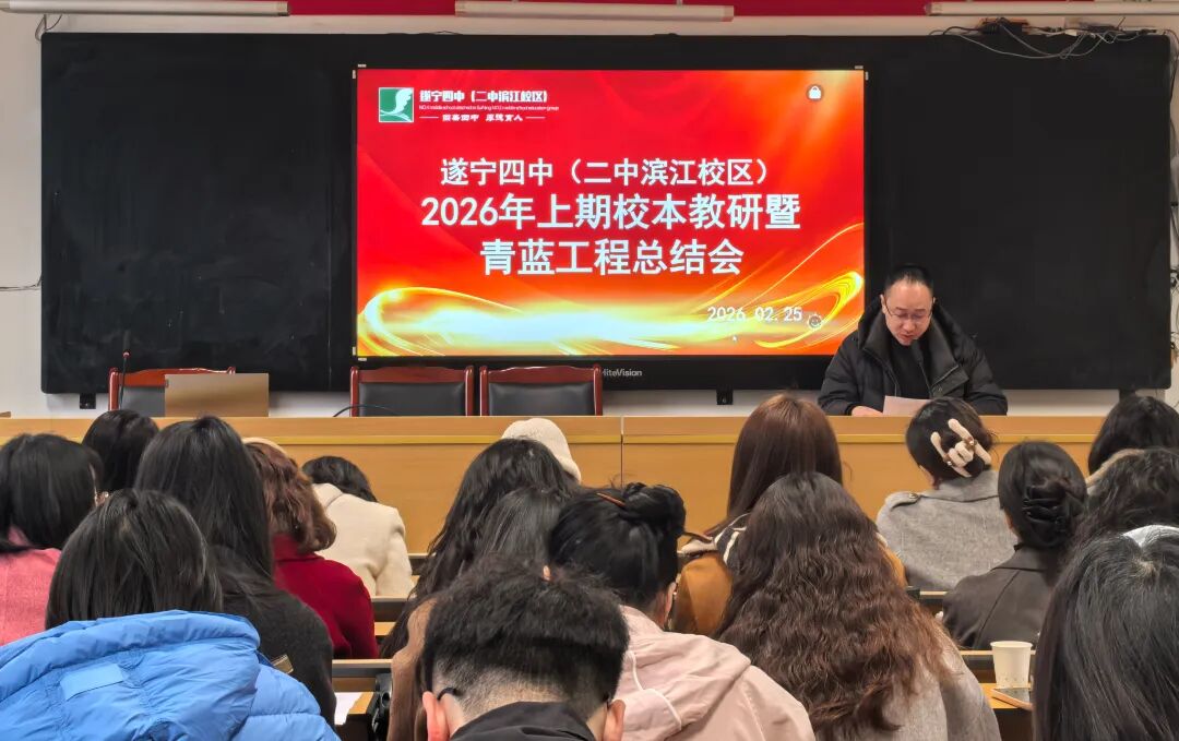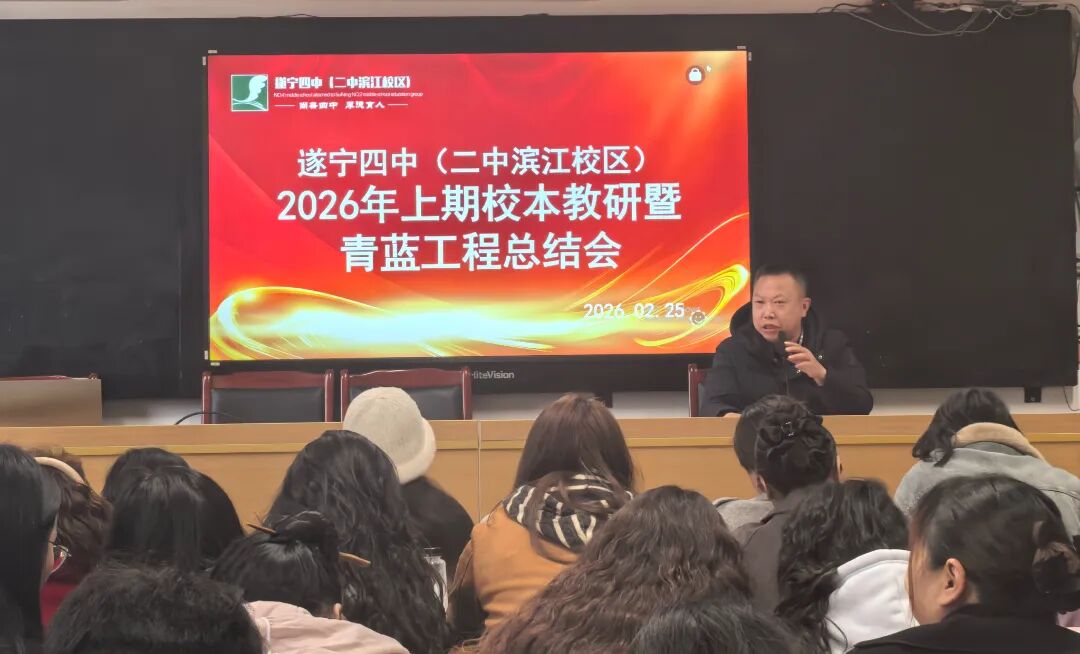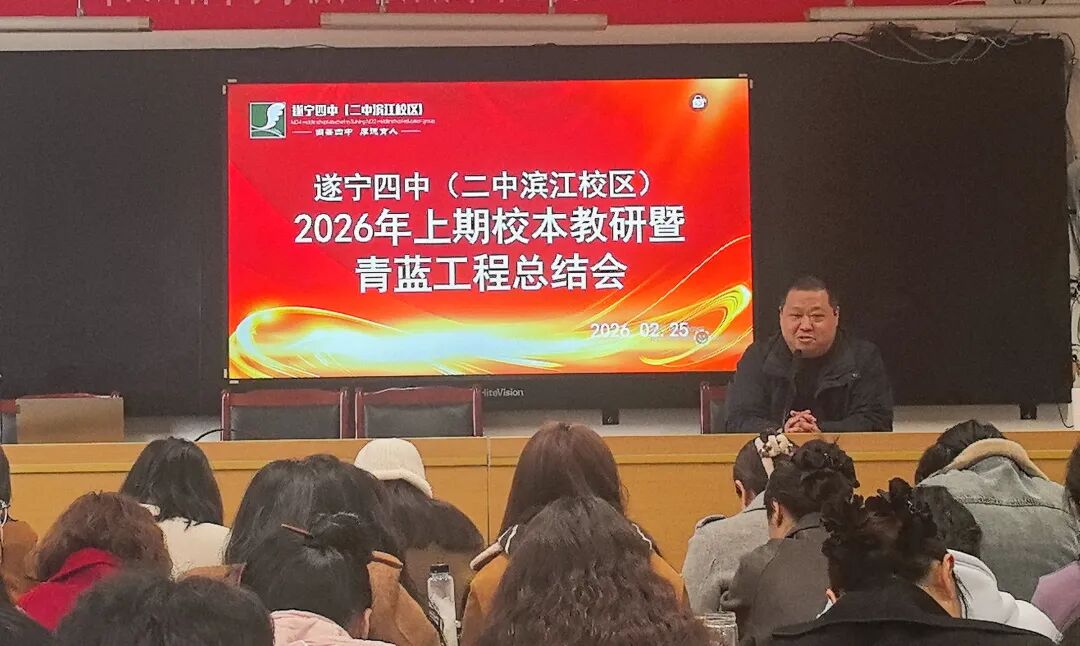 春归万物生,风暖启新程。为总结校本教研经验,深化“青蓝工程”传帮带作用,助力教师队伍高质量发展,2026年2月25日,遂宁四中(二中滨江校区)在学校会议室召开了2026年春季校本教研暨青蓝工程总结会。全体行政干部、教研组长、备课组长、35岁以下青年教师及2024-2025学年度指导教师参加了会议。