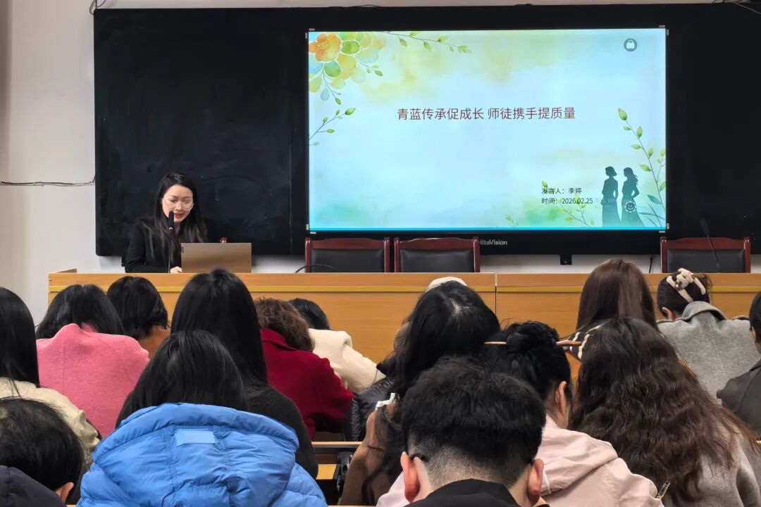 会议伊始,教务处陈娇主任对近四年来的“青蓝工程”结对工作进行了全面回顾与总结。她用详实的数据和鲜活的案例,梳理了师徒听课、磨课、教研的点点滴滴,系统展示了青年教师在教学竞赛、论文发表、班级管理等方面取得的显著成效。四年来,“青蓝工程”不仅是技能的传递,更是教育初心的接力。