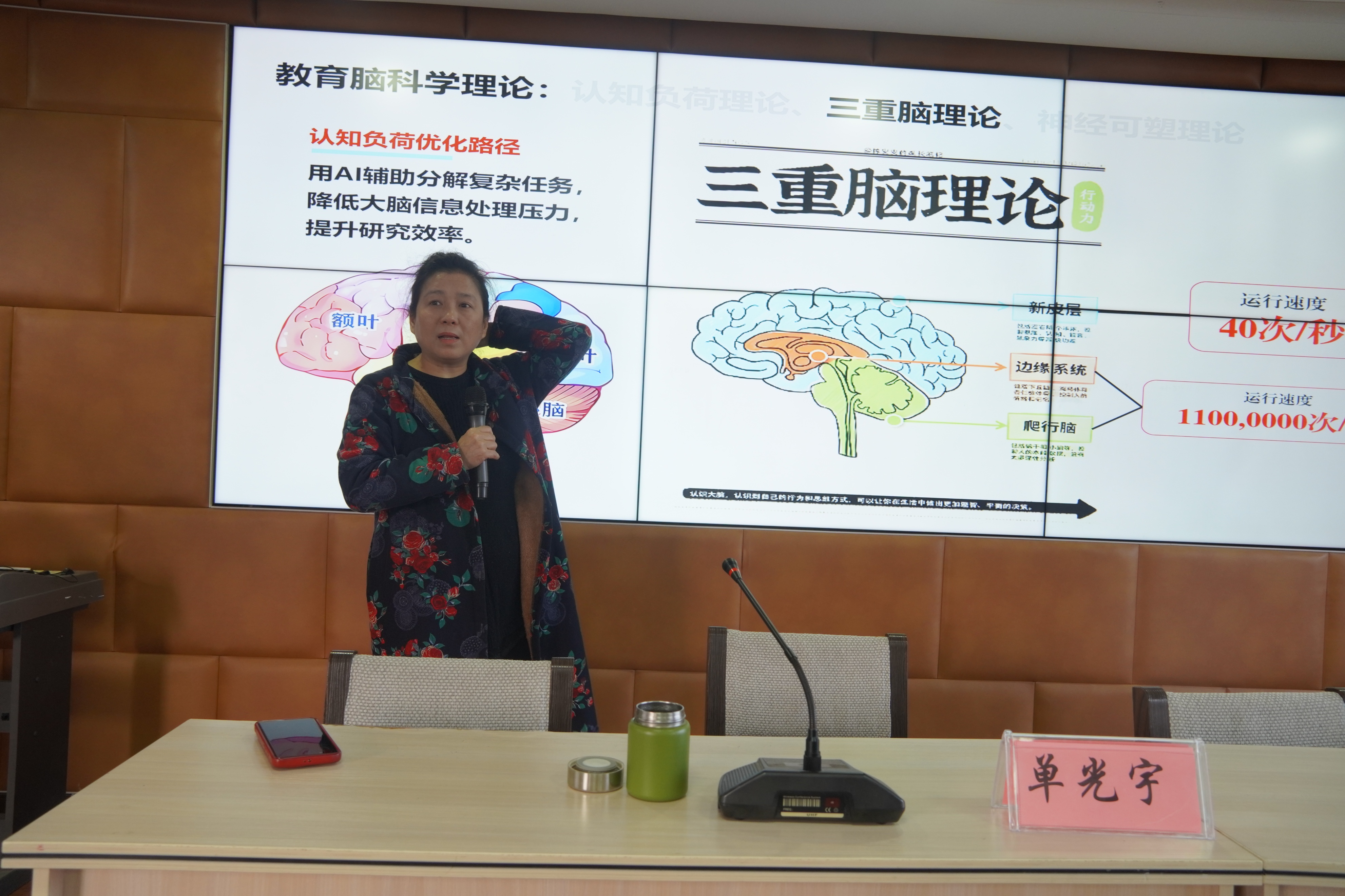 上午,单光宇老师以“AI助力,精准研究”为主题开讲,聚焦科研报告撰写,明确申请、开题、中期、结题各阶段连贯一致的要求,指导教师运用AI提示词高效辅助报告生成,还带领大家学习认知负荷理论,筑牢教研理论根基。在“豆包助研”实操环节,教师们掌握了AI在录音转写、纪要生成、PPT制作等场景的应用方法,习得课例研究优化流程与三段式文本分析方法,打破“研究与教学二元对立”的误区。