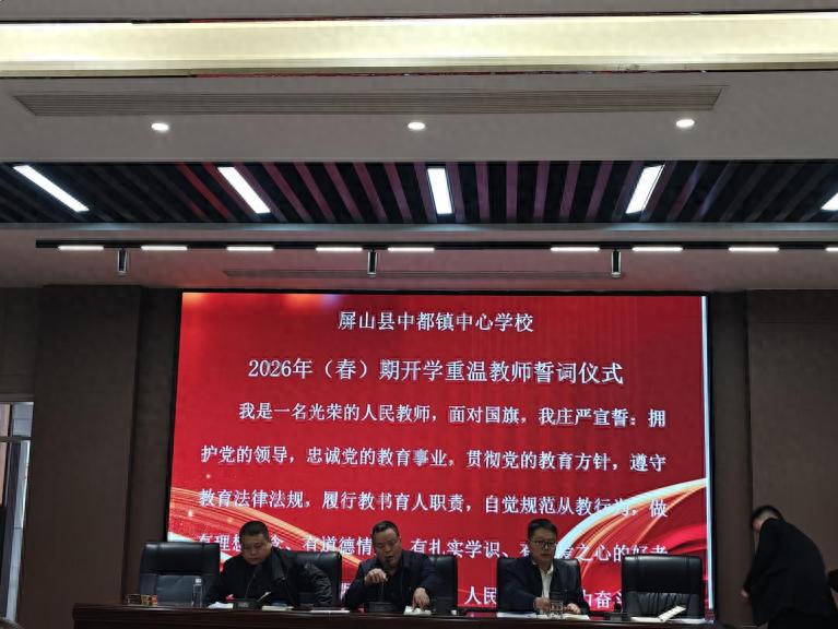 为进一步加强师德师风建设,筑牢教育初心,2月28日,屏山县中都镇中心学校在该校党支部书记、校长廖承君的带领下,举行了2026年春期开学重温教师誓词仪式。全校教职工以饱满的精神状态共同参与了这一庄严仪式。