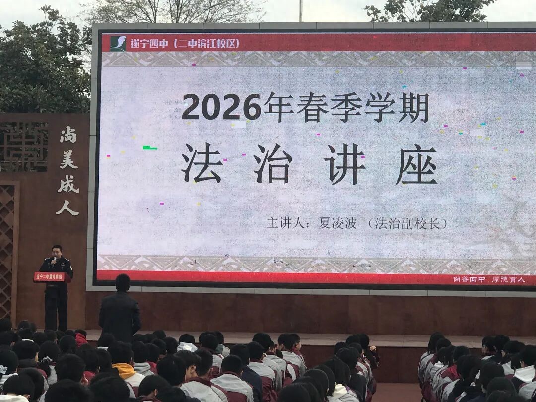 为增强学生法治观念,筑牢校园安全防线,3月2日,遂宁四中(二中滨江校区)开展2026年春季学期未成年人保护与新《治安管理处罚法》法治安全专题讲座。本次讲座邀请学校法治副校长夏凌波同志担任主讲人,全体学生参与学习。