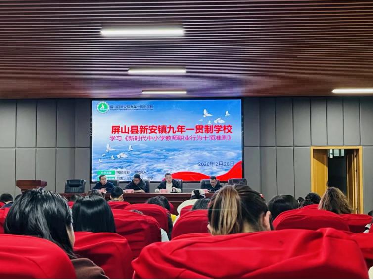 为全面加强新时代教师队伍建设,进一步规范教师职业行为,筑牢师德师风防线,确保新学期教育教学工作平稳有序开展,2月28日,屏山县新安镇九年一贯制学校召开了2026年春期开学师德师风专项工作会议。学校领导班子、全体教职工参加本次会议,会议由学校党支部副书记牟建主持。