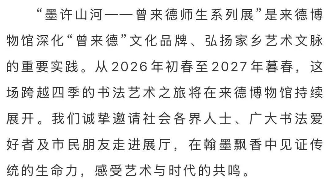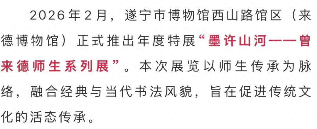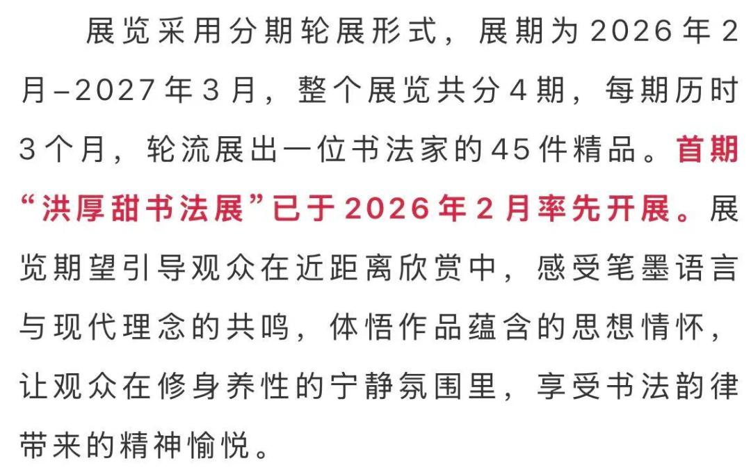洪厚甜作品欣赏行书《丈雪通醉什邡重建罗汉寺记》34cmx69cm 2025年楷书《培修古昭觉堰渠并雪翁亭碑记》240cmx129cm 2025年楷书《临北魏申洪之墓志》123cmX60cm 2024年观展指南展览名称“墨许山河——曾来德师生系列展”展览时间2026年2月-2027年3月展览地点遂宁市博物馆西山路馆区(来德博物馆)来德博物馆四川省遂宁市船山区西山北路四川宋瓷博物馆(来源:遂宁文联/四川宋瓷博物馆)