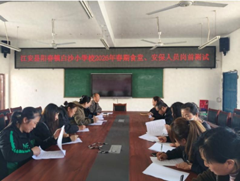 以考促学,强化责任意识 培训前,江安县阳春镇白沙小学校组织全体食堂、安保人员进行了岗前测试。测试内容紧密围绕食品安全操作规范、校园安保岗位职责、应急处置流程等核心要点,全面检验从业人员的专业知识储备与安全意识。通过以考促学的方式,进一步强化了全体人员“安全第一、责任至上”的工作理念,为后续规范开展各项工作奠定了坚实基础。