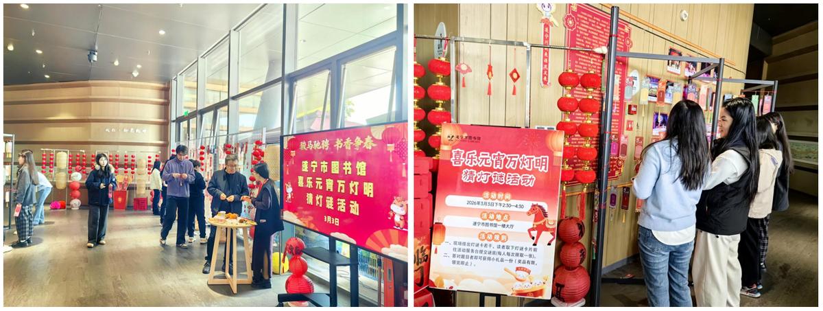 元宵添阅趣・书香再启程—元宵猜灯谜活动。“喜乐元宵万灯明”元宵节猜灯谜活动采用线上+线下相结合的形式开展,线下现场悬挂涵盖字谜、成语谜、历史常识等元素的灯谜若干条,吸引不同年龄段读者广泛参与。线上依托微信平台扩大覆盖面、方便群众便捷参与,让更多群众足不出户感受元宵文化魅力。猜灯谜活动将传统文化与阅读推广有机融合,共吸引千余人次参与,既丰富了广大读者节日文化生活,又营造了欢乐祥和的元宵氛围。