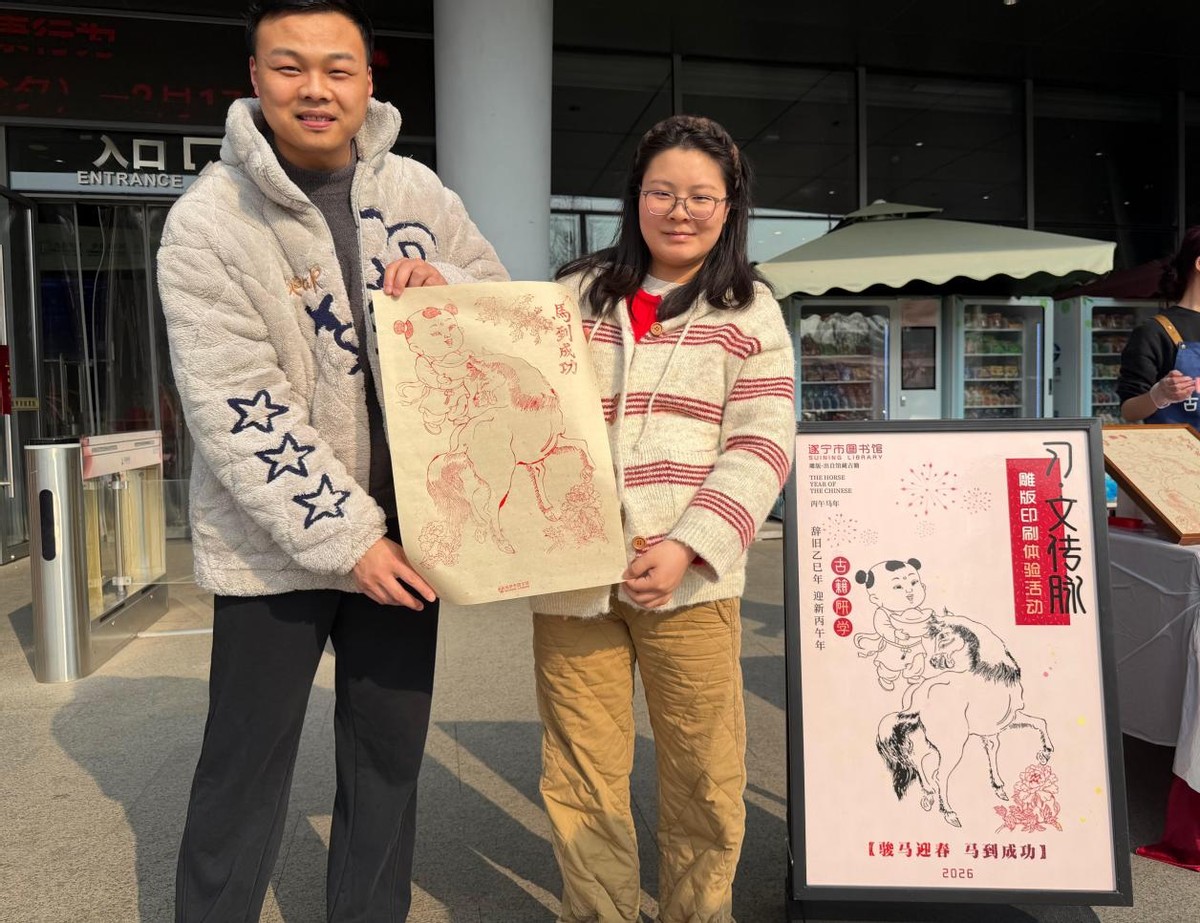雕版印年味·双色传匠心——传统技艺的新春传承。2月10日、18日,在遂宁市图书馆开展的“双色雕版印刷体验活动”,将古代雕版印刷技艺与地方年俗文化相融合,现场演示双色套印工艺流程,市民亲手参与印制蕴含吉祥寓意的年画作品。在墨香氤氲与纸韵流转间,参与者不仅领略了传统工艺的色彩层次之美,更在指尖触摸中感悟非遗文化的匠心传承。活动共吸引580名市民现场体验,成为新春期间兼具知识性与趣味性的文化互动亮点。