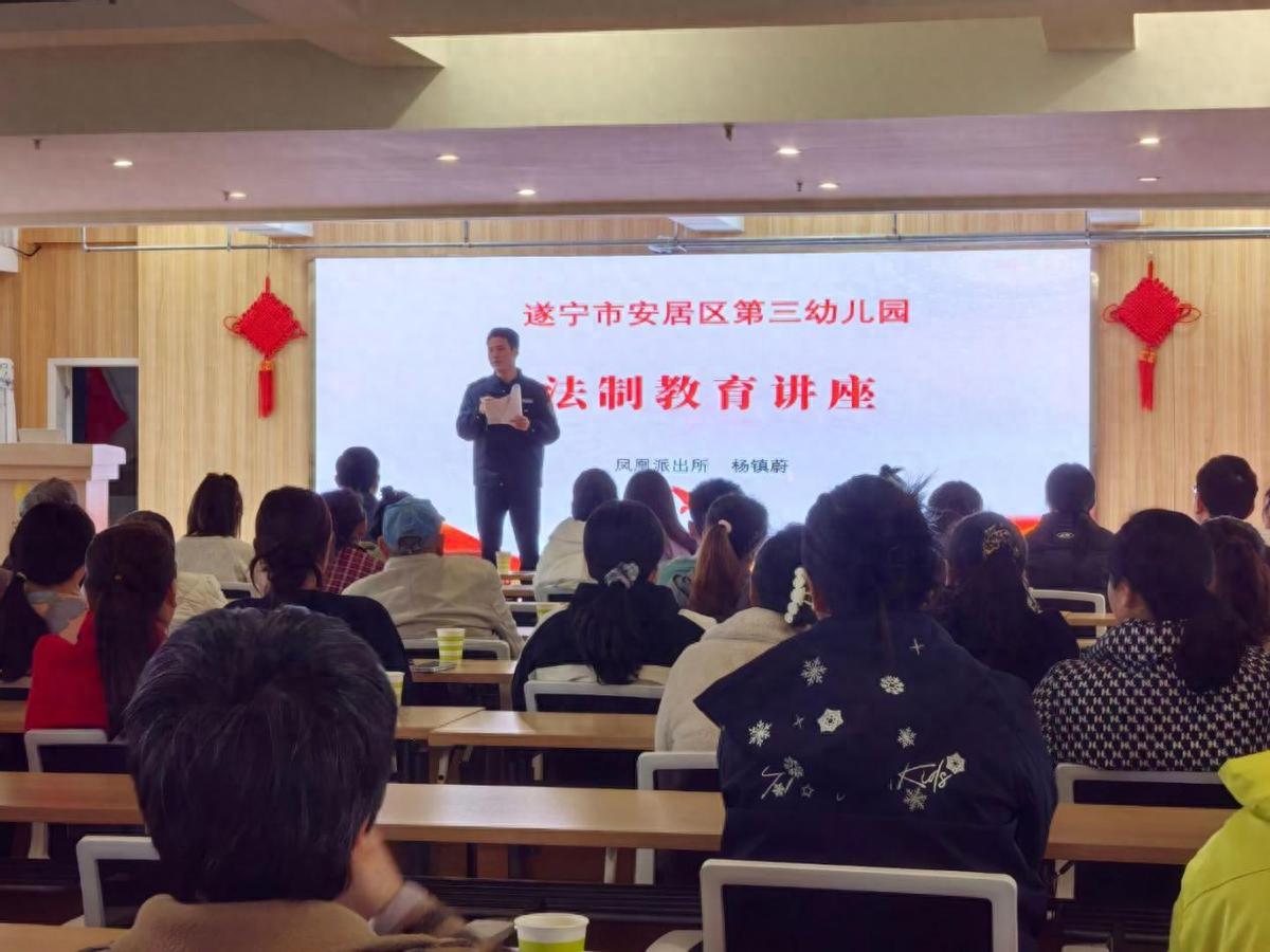 会上,园长李培虎发表致辞,回顾2025年办园成果,并对新学期学校发展方向、活动计划、家园共育等方面进行交流;安居凤凰派出所民警杨镇蔚围绕防拐骗、防性侵等多方面进行了法制安全教育讲座,强化家长法治与安全意识;安居疾控中心疾控科科长杨鑫进行了学校春季传染病防控知识培训;副园长刘佳围绕校园安全、卫生保健等作重点提醒,筑牢安全防线;保教副主任龙艾详细解读本学期保教重点工作与幼儿发展目标。