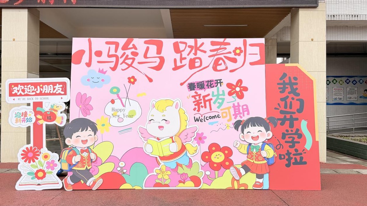 清晨的阳光洒在校门口,老师们和安保人员早已就位,以最温暖的笑容和最细致的准备,迎接每一位“回家”的孩子。彩旗在春风中轻轻摇曳,仿佛在诉说着对同学们的思念。焕然一新的黑板报上,“欢迎同学们返校”、“新学期,新起点”的字样格外醒目,旁边点缀着寓意“策马扬鞭”的骏马图案,激励着每一位踏入校园的学子。