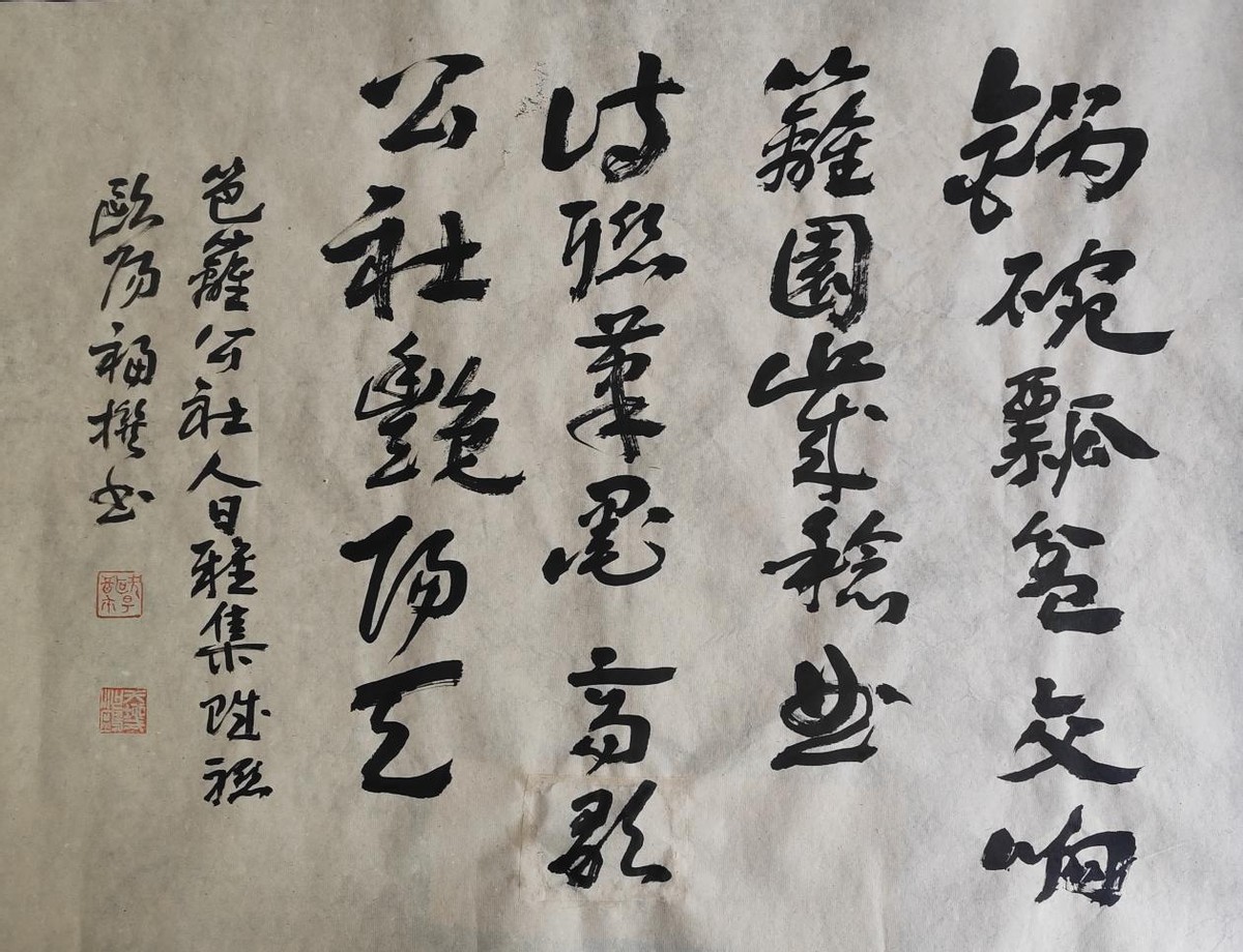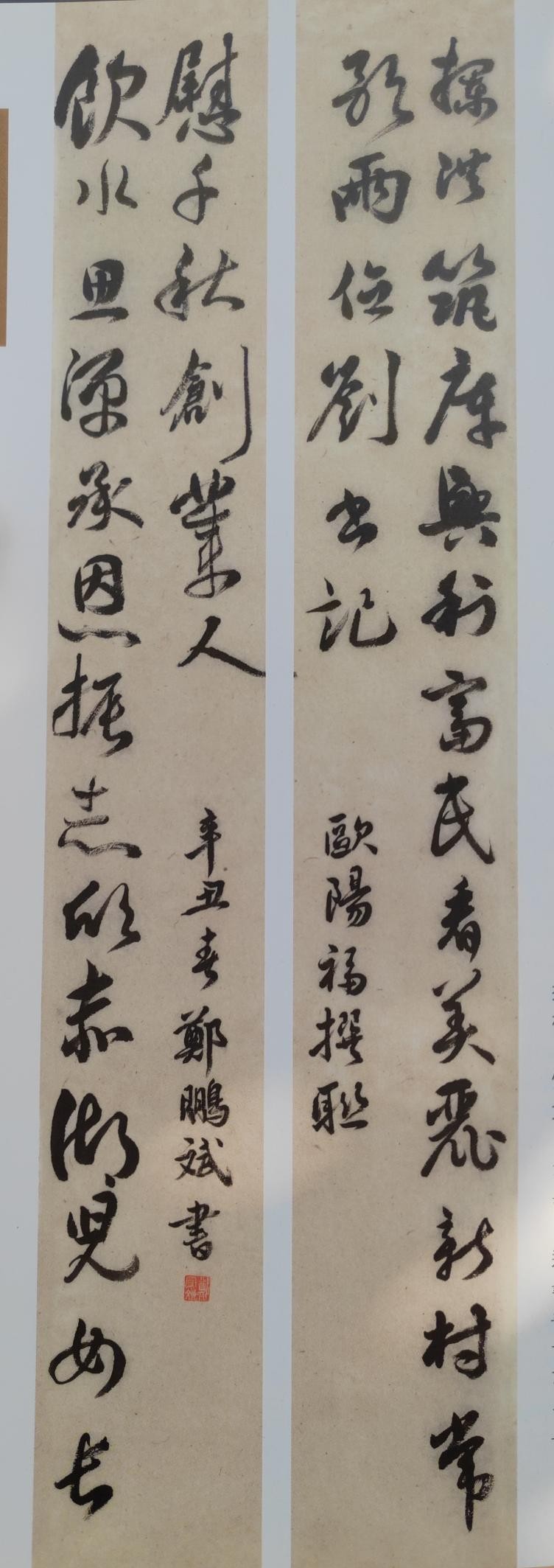 (欧阳福撰书联:锅碗瓢盆,交响篱园岁稔曲;诗联笔墨,高歌公社艳阳天)
