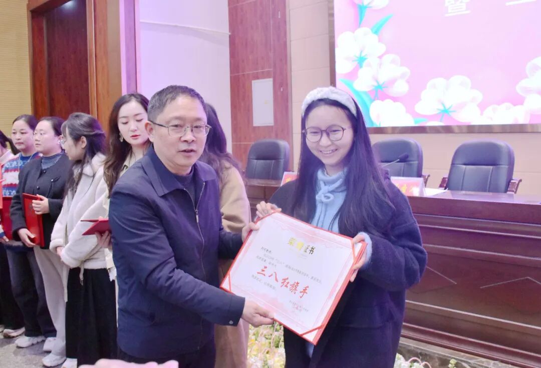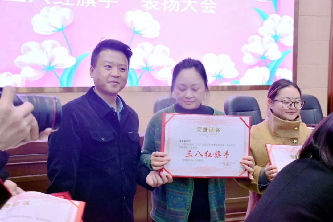 随后,曾圣洪宣读了《遂宁一中2026年“三八红旗手”表彰决定》。在热烈的掌声中,校领导共同为获得表彰的优秀女教职工颁发荣誉证书,并合影留念。闪亮的证书,映照着她们日复一日的坚守与奉献,记录着她们在育人路上的智慧与温情。